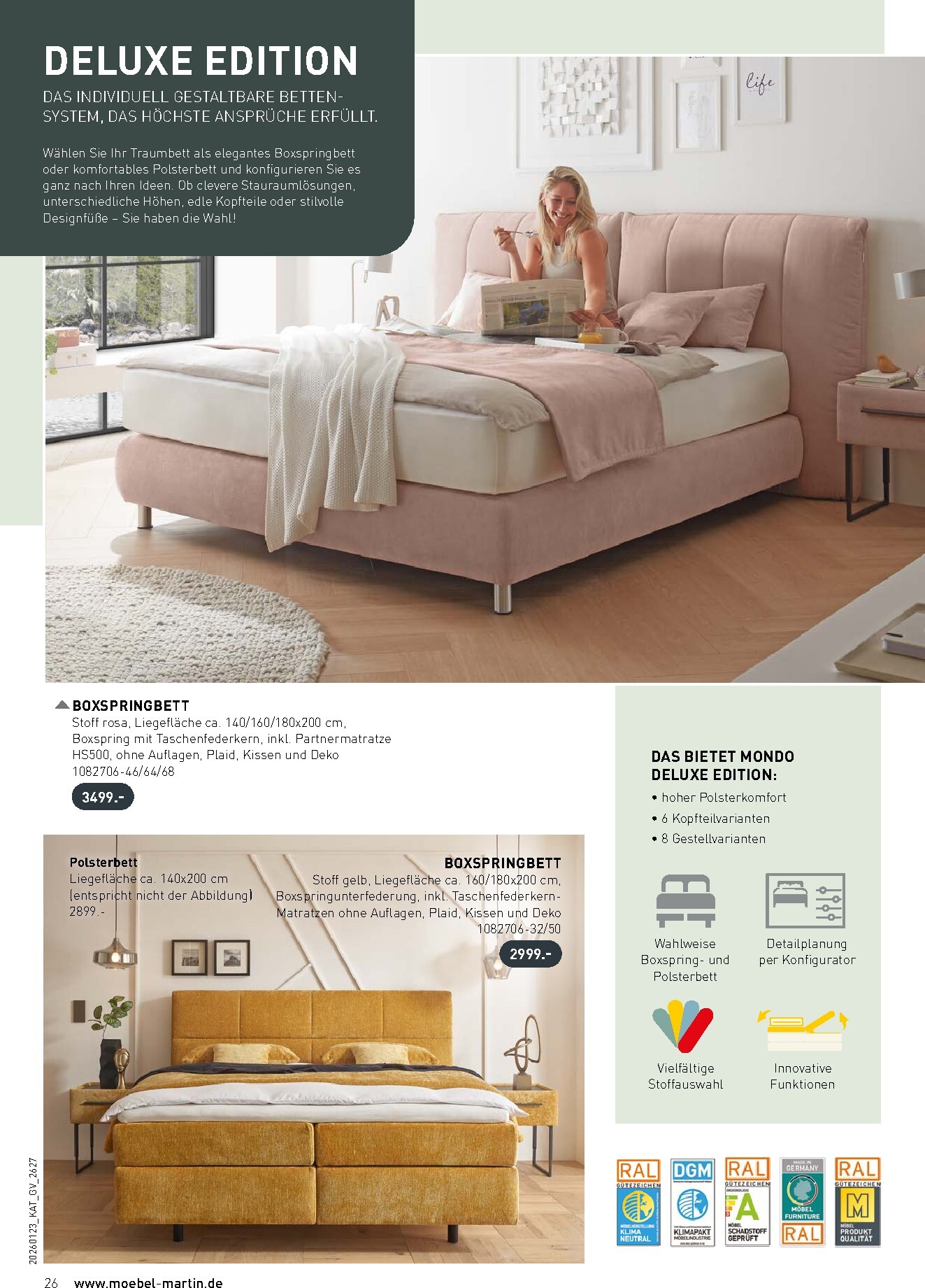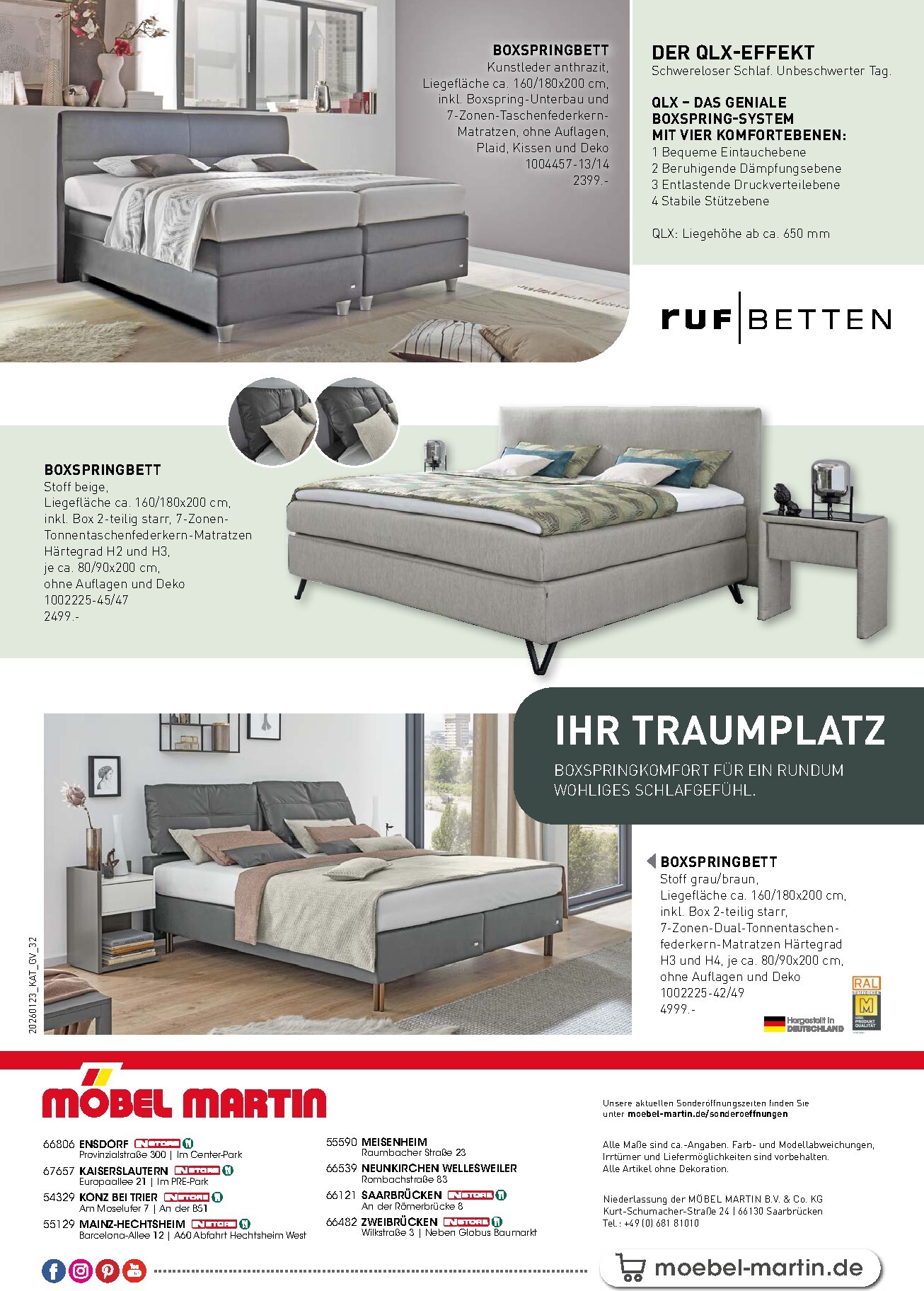 Für erholsame Nächte und einen perfekten Start in den Tag sorgt die exklusive Auswahl an Boxspringbetten. Das Möbel Martin Prospekt Heute 2026 Angebote Angebote zum Blättern wird durch hochwertige Systeme wie das QLX-Boxspring-System von RUF Betten oder das stilvolle Boxspringbett „Endorf“ für 2499 € auf ein neues Level gehoben. Diese Betten kombinieren modernes Design mit erstklassigem Liegekomfort durch 7-Zonen-Matratzen und stabile Unterbauten. Gönnen Sie sich den Luxus eines Schlaferlebnisses, das pure Entspannung verspricht und Ihr Schlafzimmer in eine Ruhezone verwandelt.