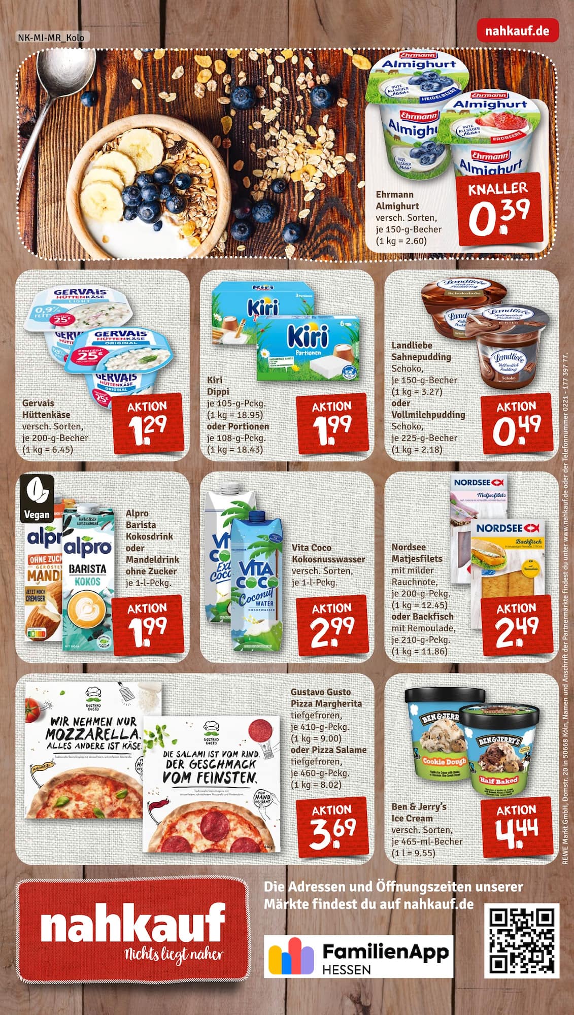 Auch für den kleinen Hunger zwischendurch und süße Momente ist gesorgt. Der cremige Ehrmann Almighurt Joghurt ist in verschiedenen Sorten bereits für sensationelle 0,39 Euro pro Becher zu haben. Für Käseliebhaber gibt es Kiri Dippi oder Portionen im Angebot für 1,99 Euro. Und als krönenden Abschluss eines leckeren Essens wartet das beliebte Ben & Jerry’s Eis in diversen Sorten für 4,44 Euro auf Sie. Stöbern Sie durch alle Angebote und entdecken Sie Ihre persönlichen Favoriten im aktuellen Nahkauf Prospekt.