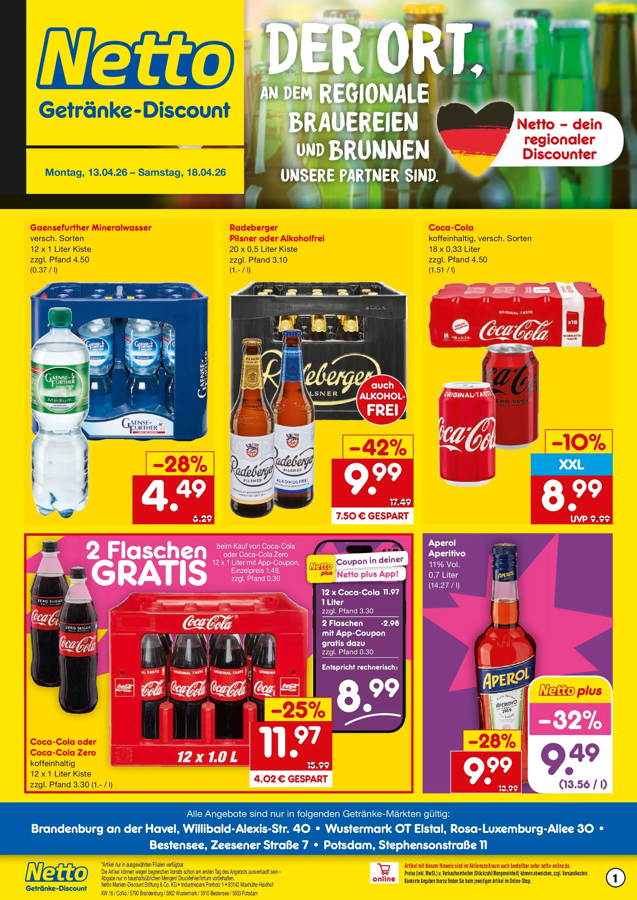 In der Woche vom 13. bis zum 18. April 2026 feiert Netto seine regionalen Partner und bietet erfrischende Getränke zu unschlagbaren Preisen. Unter dem Motto „Der Ort, an dem regionale Brauereien und Brunnen unsere Partner sind“, finden Sie eine große Auswahl an lokalen Spezialitäten. Nutzen Sie die Gelegenheit, um mit den Netto Marken-Discount Prospekt 13.04.2026 – 18.04.2026 Online Prospekt kräftig zu sparen. Ein hervorragendes Beispiel ist das Gaensefurther Mineralwasser in verschiedenen Sorten: Eine Kiste mit 12 x 1-Liter-Flaschen erhalten Sie für nur 4,49 € statt 6,29 €, was einer Ersparnis von 28% entspricht.