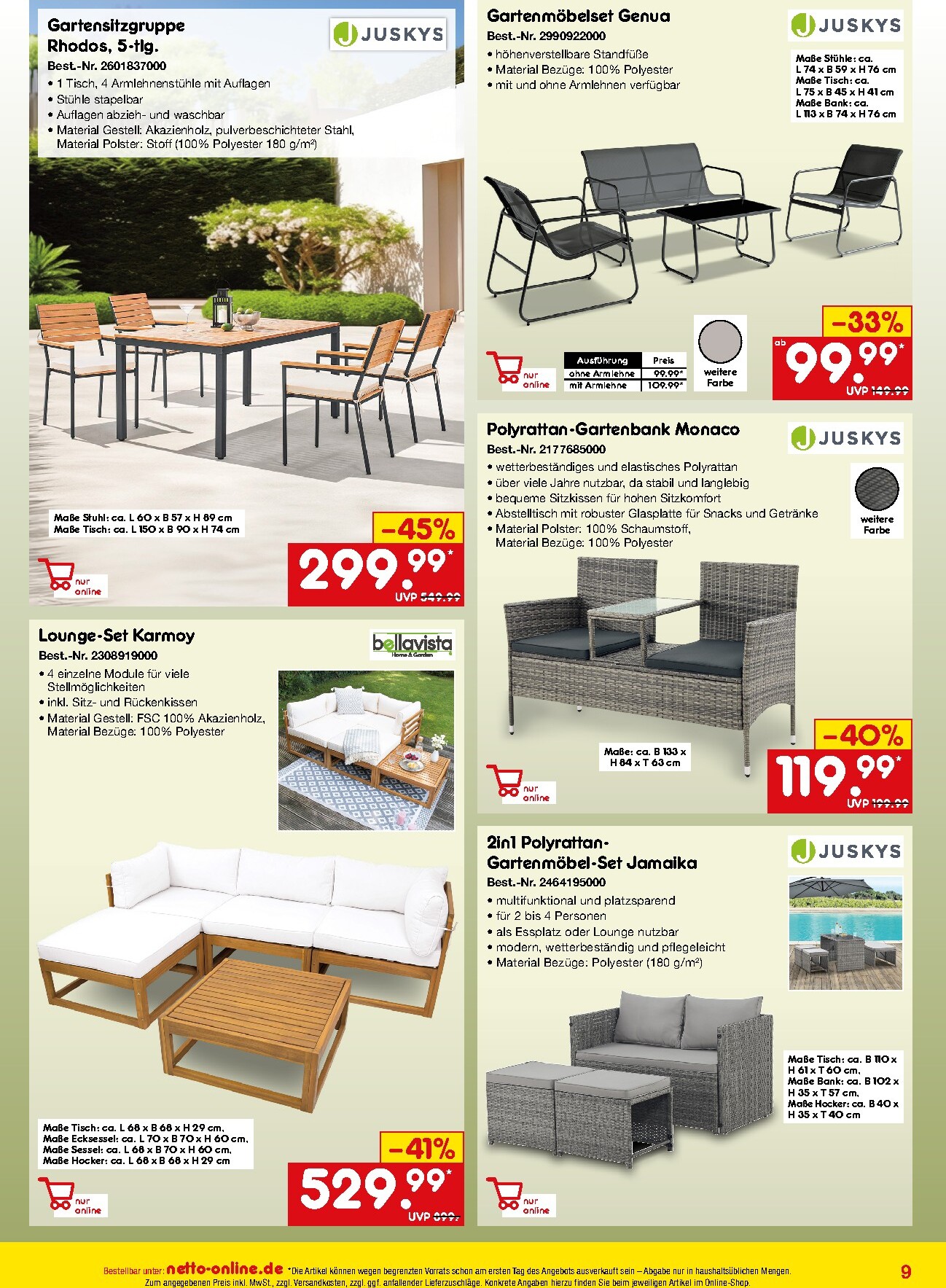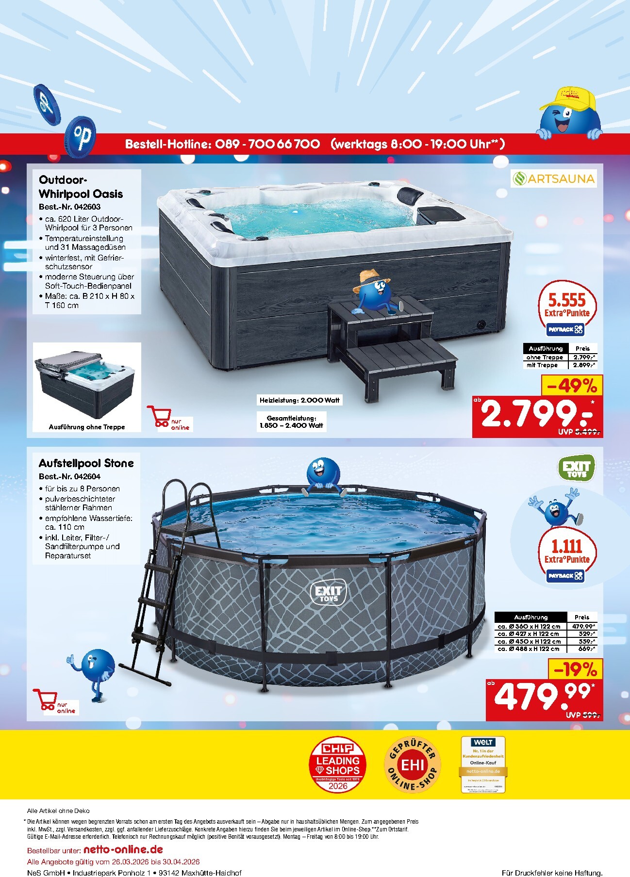 Neben der Elektromobilität auf zwei oder drei Rädern denkt Netto auch an den Spaß im eigenen Garten und praktische Transportlösungen. Die aktuellen Angebote sind perfekt, um den Garten in eine Wohlfühloase zu verwandeln oder Familienausflüge zu planen. Für alle, die von einem eigenen Spa träumen, ist der Outdoor-Whirlpool Oasis für 2.799 €, mit einer Ersparnis von 49 %, ein absolutes Highlight. Wenn Sie nach einer einfacheren Abkühlung suchen, ist Netto Marken-Discount Prospekt 26.03.2026 – 30.04.2026 Angebote Angebote zum Blättern die richtige Wahl, denn der Aufstellpool Stone für bis zu 6 Personen ist für nur 479,99 € verfügbar.