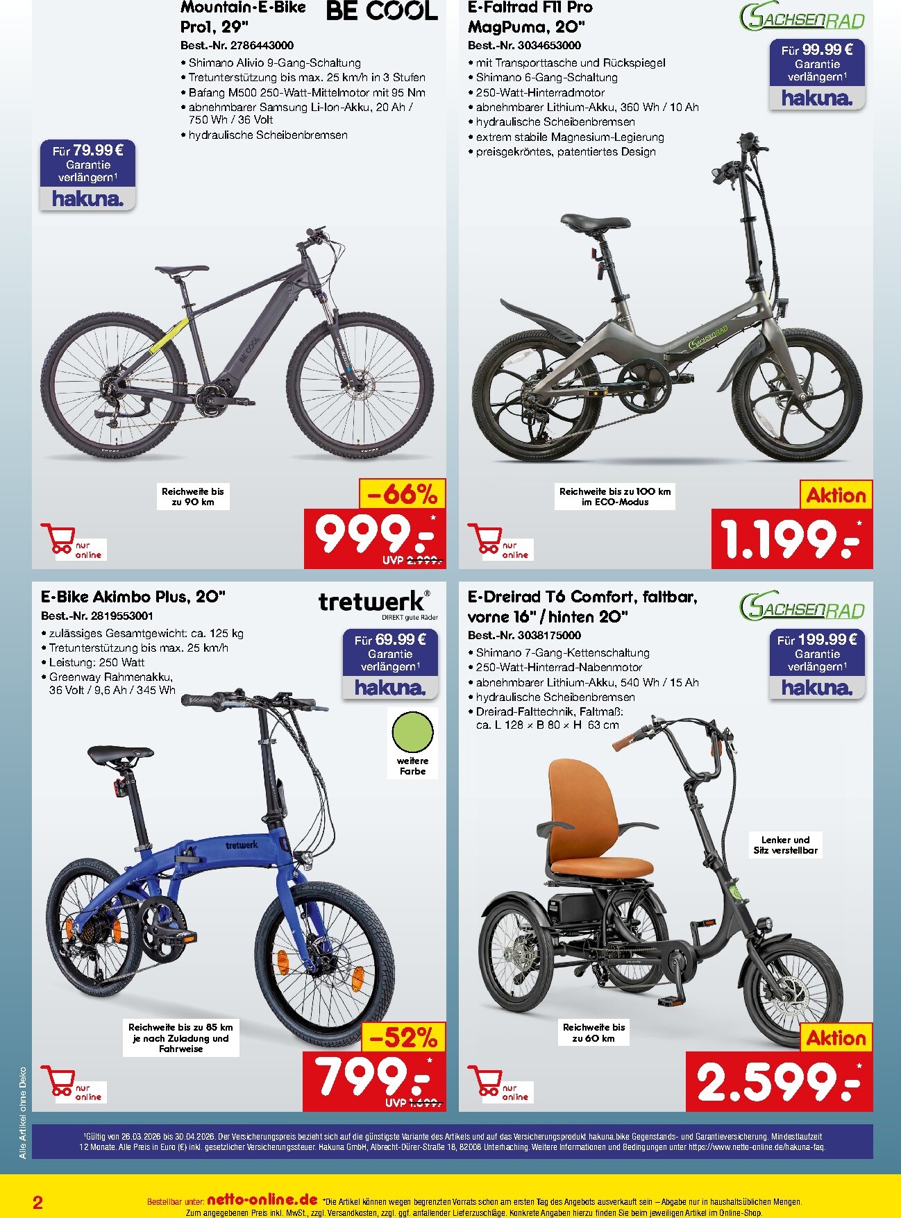 Der Frühling steht vor der Tür und Netto Marken-Discount läutet die Saison mit sensationellen Angeboten für E-Bikes und Outdoor-Artikel ein, die bequem online bestellt werden können. Im aktuellen Prospekt, gültig bis Ende April 2026, finden Sie eine beeindruckende Auswahl an Fahrrädern für jeden Bedarf. Besonders hervorzuheben ist das Prophete E-Dreirad für Erwachsene, das mit einem Rabatt von 34 % für nur 2.099 € erhältlich ist. Auch das E-City-Bike Geniesser 4.0 sticht mit einem Preis von 1.599 € und einer Ersparnis von 38 % heraus. Diese Angebote zeigen, dass Netto Marken-Discount Prospekt 26.03.2026 – 30.04.2026 Angebote Angebote zum Blättern eine großartige Gelegenheit bietet, um mobil und umweltfreundlich in die neue Saison zu starten.