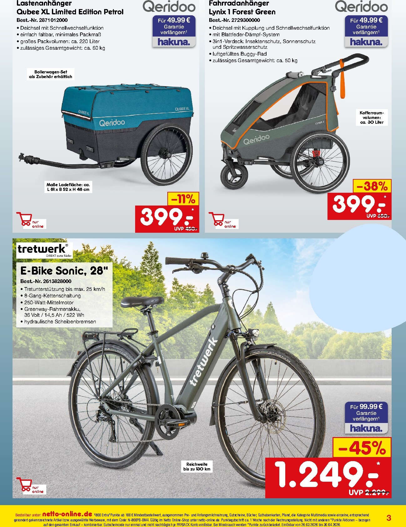 Für den Transport von Einkäufen oder den Nachwuchs bietet der Prospekt ebenfalls clevere Lösungen. Der Qeridoo Lastenanhänger und der Fahrradanhänger Lynts 1 sind beide für je 399 € im Angebot und machen das Auto oft überflüssig. Diese und viele weitere fantastische Deals für einen aktiven Frühling und Sommer finden Sie im aktuellen Netto Marken-Discount Prospekt.