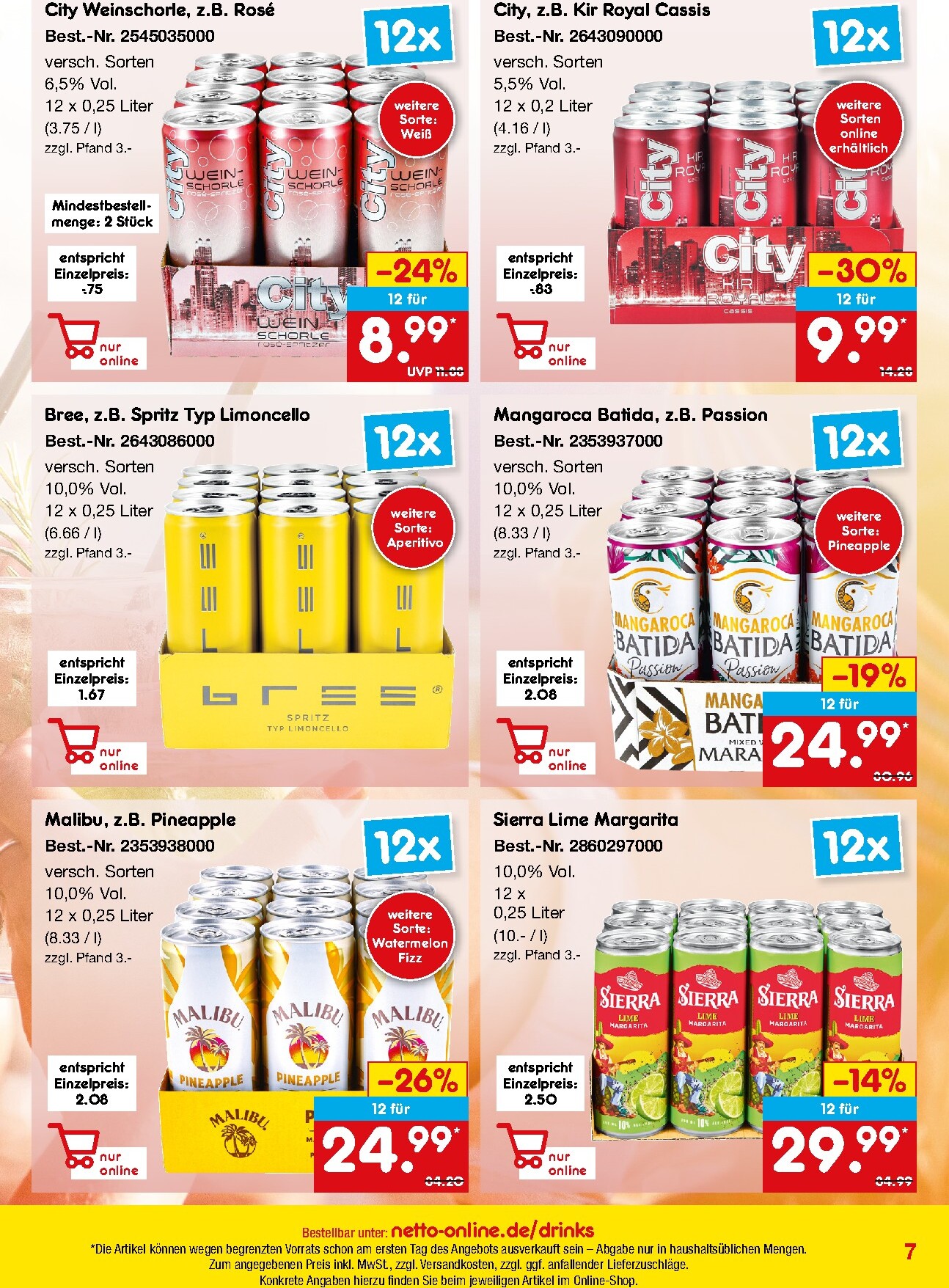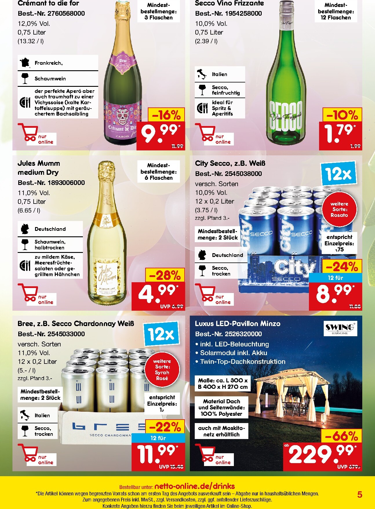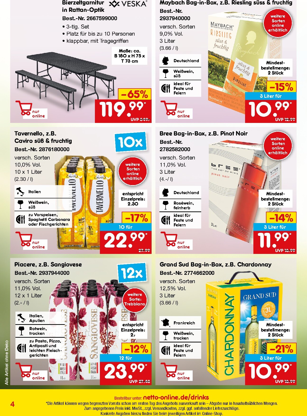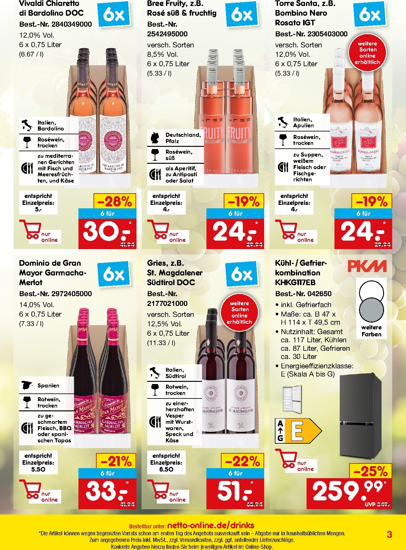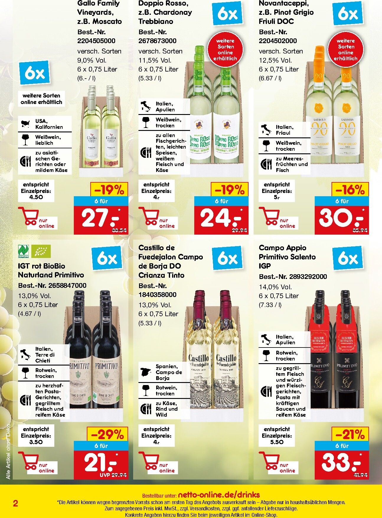 Die Auswahl im Netto Online-Shop geht aber weit über Aperitifs und Weißweine hinaus. Auch Freunde von kräftigen Rotweinen und fruchtigen Rosés kommen auf ihre Kosten. Entdecken Sie die Netto Marken-Discount Prospekt 26.04.2026 – 30.04.2026 digitaler Prospekt und sichern Sie sich zum Beispiel das 6er-Paket Campo Appio Primitivo Salento IGP aus Italien für nur 33,- € statt 41,94 €. Dieser trockene Rotwein ist der ideale Partner für Gegrilltes und würzige Käsesorten. Aus Spanien stammt der Fuedejalon Campo de Borja DO Crianza Tinto, dessen 6er-Karton für nur 24,- € erhältlich ist. Und für Rosé-Fans bietet sich der Bree Rosé süß & fruchtig aus der Pfalz an, ebenfalls für 24,- € im 6er-Pack.