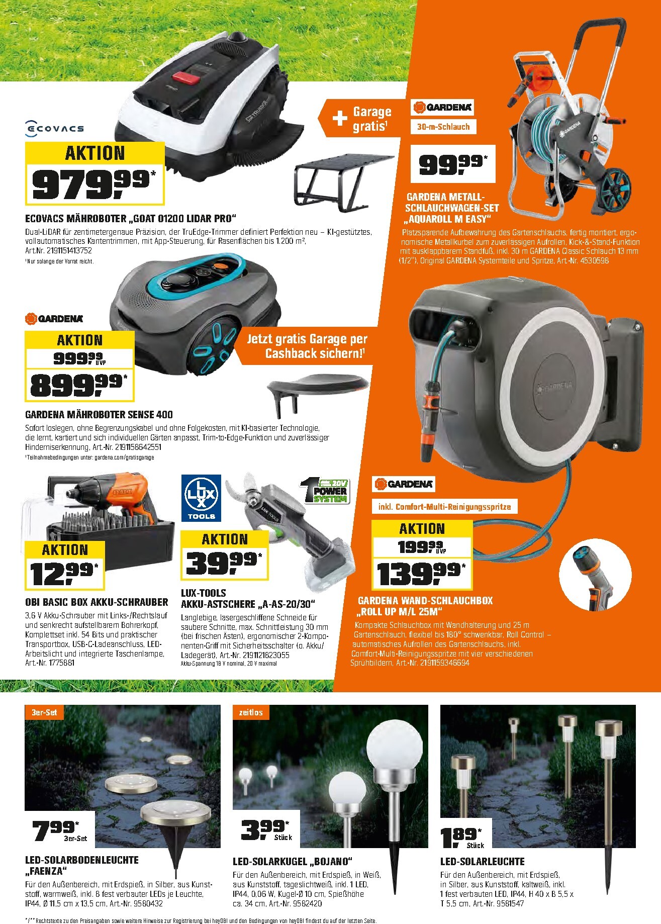 Für eine makellose Rasenpflege ohne Mühe sorgt der Ecovacs Mähroboter GOAT G1200 Lidar Pro, der als besonderes Aktionshighlight für 979,99 € erhältlich ist. Dieses hochmoderne Gerät übernimmt die Arbeit vollautomatisch und sorgt für einen perfekt geschnittenen Rasen. Wer lieber selbst Hand anlegt, findet mit der stabilen OBI Schubkarre für nur 29,99 € den idealen Helfer für alle anfallenden Gartenarbeiten. Mit diesen praktischen Werkzeugen und Geräten wird die Gartenarbeit effizienter und macht gleich doppelt so viel Spaß.
