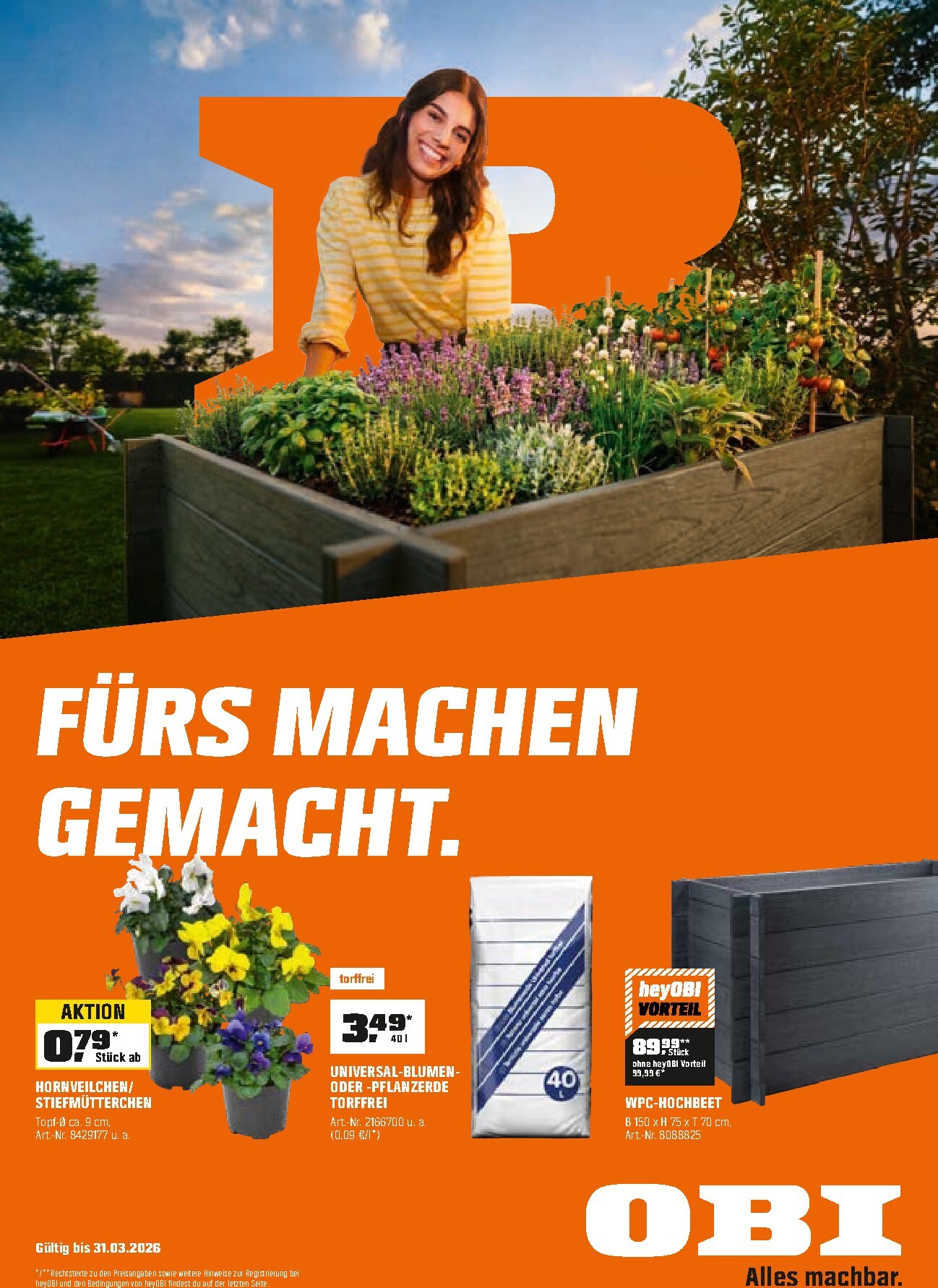Für alle, die von einem eigenen Gemüse- oder Kräutergarten träumen, ist das WPC-Hochbeet die perfekte Lösung. Es ist nicht nur robust und witterungsbeständig, sondern auch ergonomisch und schont den Rücken bei der Gartenarbeit. Mit den OBI Prospekt 31.03.2026 zum Blättern Online Online wird der Traum vom eigenen Hochbeet jetzt besonders günstig. Als heyOBI Kunde profitieren Sie von einem exklusiven Vorteilspreis und erhalten das geräumige Hochbeet in den Maßen 150 x 75 x 70 cm für nur 89,99 € statt der regulären 99,99 €.