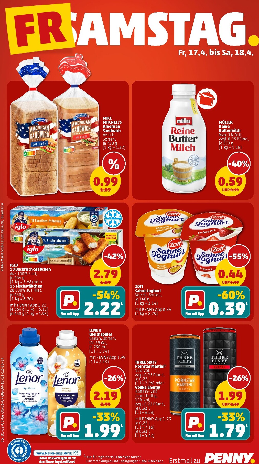 Neben den Lebensmitteln bietet Penny auch attraktive Preise im Drogerie- und Haushaltsbereich. Produkte von Nivea, wie die klassische Creme oder die Soft-Creme, sind für 3,85 € erhältlich. Für die Kleinsten gibt es Babywell Windeln und Pants zu reduzierten Preisen. Die Penny Prospekt 13.04.2026 – 18.04.2026 Angebote nächste Woche werden zum Wochenende hin sogar noch besser. Ab Freitag, dem 17. April 2026, locken weitere Top-Deals: Iglo Backfisch-Stäbchen gibt es für nur 2,79 €, und mit der App sogar für 2,22 €. Auch der Zott Sahne Joghurt ist mit einem App-Rabatt von 60% für nur 0,39 € ein absolutes Muss für jeden Joghurt-Fan.