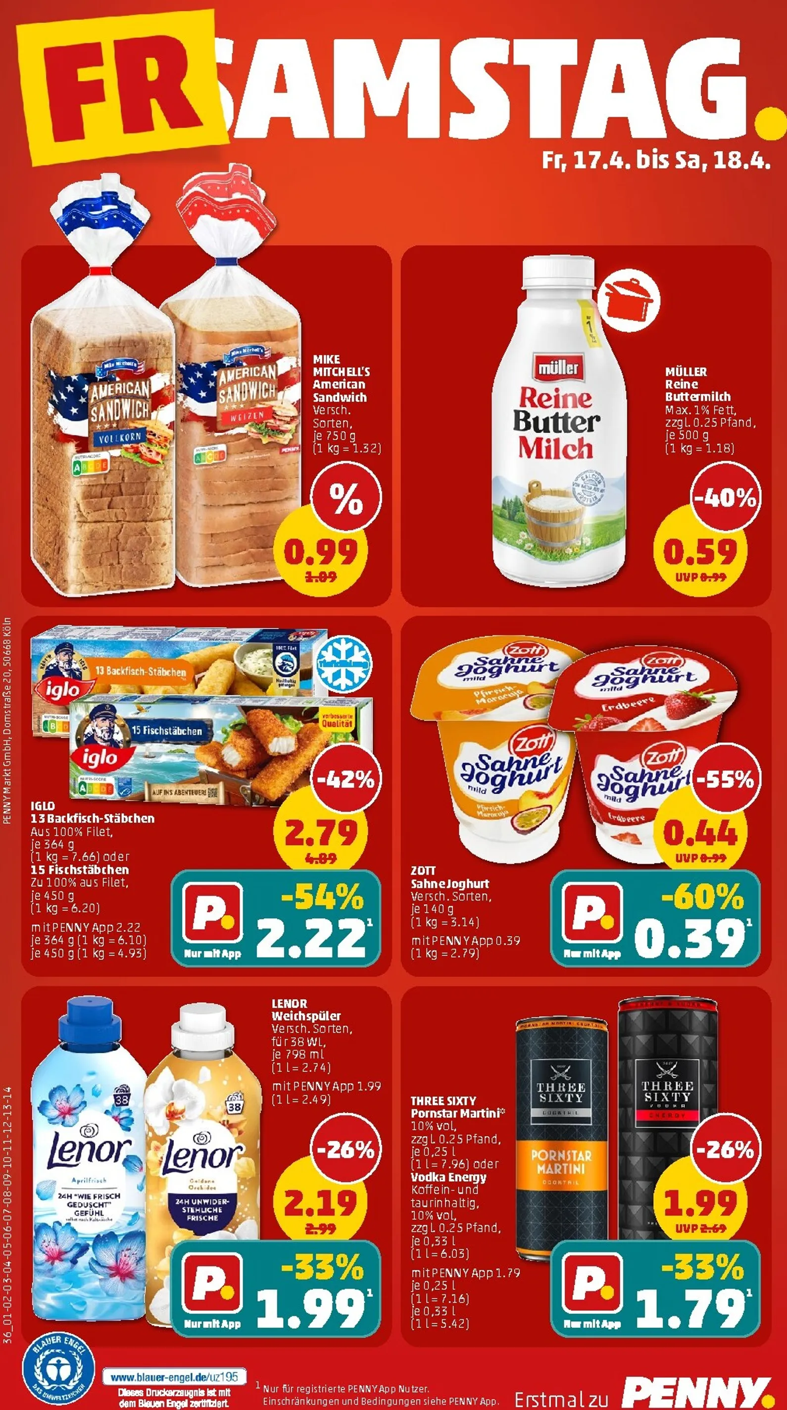 Das Wochenende wird mit weiteren Top-Angeboten abgerundet. Der Lenor Weichspüler sorgt für nur 1,99 € (mit App) für frische Wäsche, während das Mike Mitchell’s Sandwichbrot für 0,99 € perfekt für den schnellen Hunger ist. Alle Details zu den Aktionen finden Sie im aktuellen Penny Prospekt. Profitieren Sie von diesen Preisen, denn Penny Prospekt ab 13.04.2026 macht Ihren Einkauf besonders lohnenswert.
