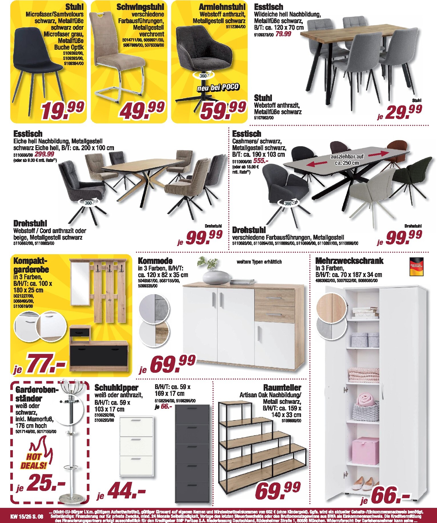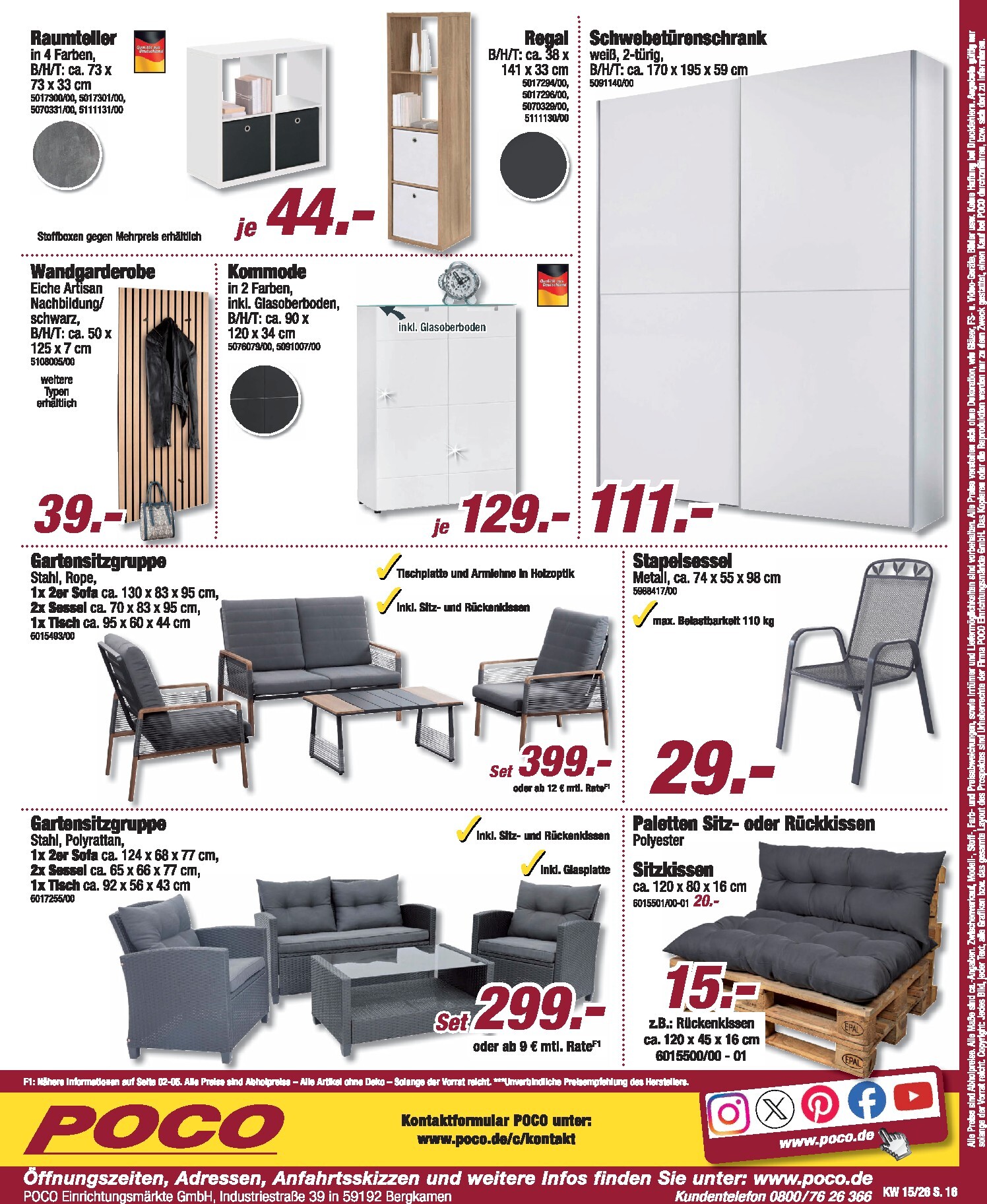 Doch das ist noch nicht alles. Bereiten Sie Ihren Garten oder Balkon auf sonnige Tage vor mit der vierteiligen Gartensitz-Essgruppe aus Polyrattangeflecht für nur 399,- statt 599,99 Euro. Im Innenbereich sorgen Sie mit dem zweitürigen Schwebetürenschrank für 111,- Euro für Ordnung im Schlafzimmer. Poco bietet für jeden Raum die passende Lösung, von praktischen Kommoden ab 129,- Euro bis hin zu dekorativen Wandgarderoben für 39,- Euro. Die Vielfalt an Stilen, von modern bis klassisch, stellt sicher, dass jeder das passende Möbelstück für seinen Geschmack und sein Budget findet.
