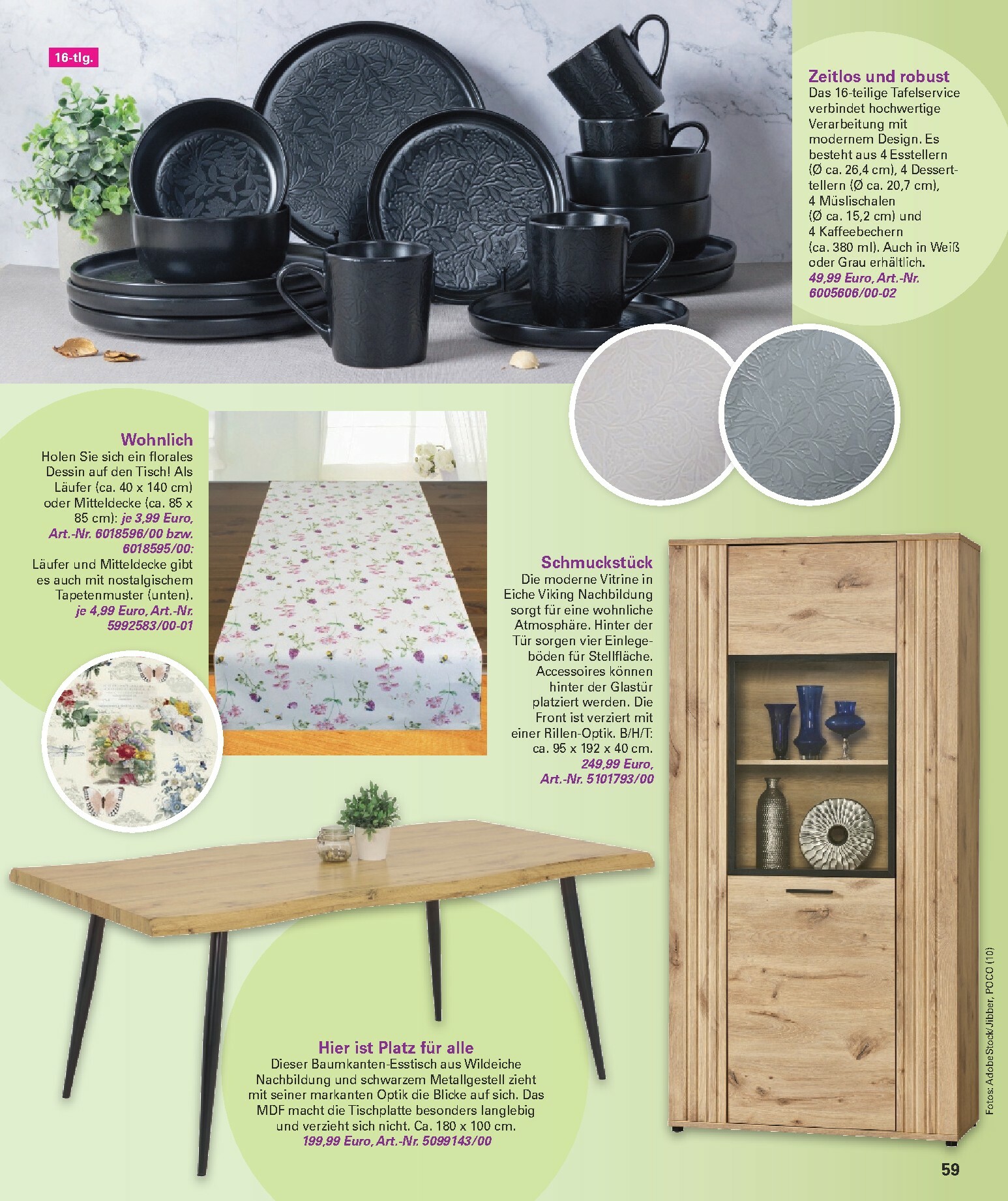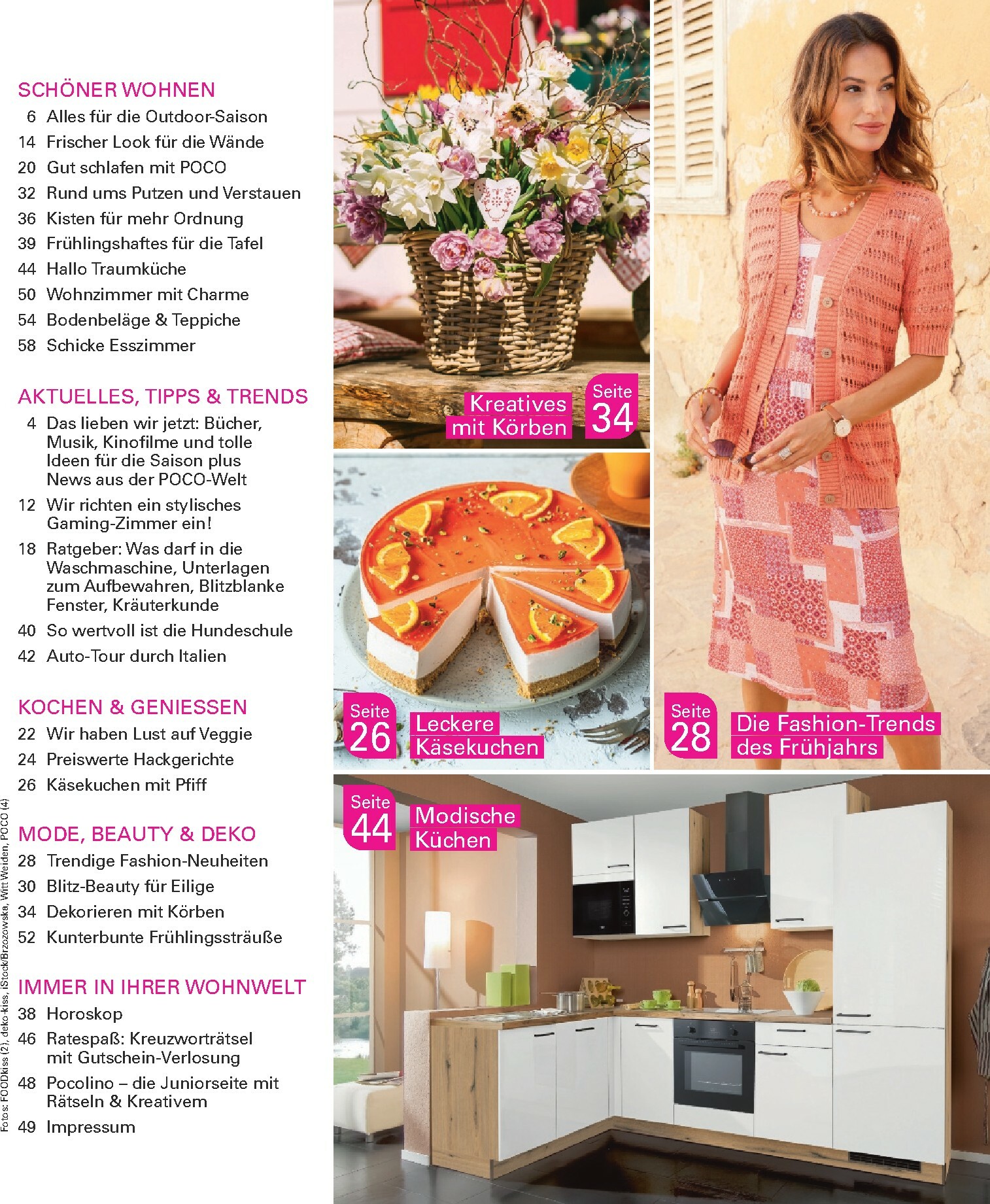 Auf dem Titelbild werden bereits die Highlights der Saison angeteasert: Machen Sie Ihren Garten oder Balkon mit der Rubrik „Garten – Alles rund um die Outdoor-Oase“ fit für die warmen Tage. Für gemütliche Stunden im Inneren bietet die Kategorie „Wohnzimmer – Entspannen ist hier angesagt“ kuschelige Sofalandschaften und stilvolle Einrichtungsideen. Auch der Essbereich kommt nicht zu kurz, wie die „Wohnen – Schicke Ideen fürs Esszimmer“ zeigen. Das Magazin ist mehr als nur ein Katalog; es bietet auch leckere Rezepte wie Käsekuchen, Modetrends für den Frühling und kreative Bastelideen, die das Angebot abrunden und für jeden etwas bereithalten.