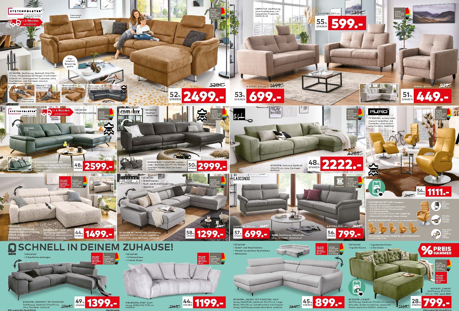 Besonders im Wohnzimmerbereich winken verlockende Angebote. Ein Highlight auf der Titelseite ist ein großzügiges Ecksofa, das von 3856 € auf nur 1499 € reduziert wurde – eine Ersparnis von 61%. Aber das ist erst der Anfang. Auf den Folgeseiten finden sich zahlreiche weitere Sofagarnituren, Sessel und Wohnlandschaften für jeden Geschmack und jedes Budget. Ob Sie nun ein modernes Boxspringsofa für 2599 € oder eine stilvolle Garnitur für 599 € suchen, Porta bietet eine riesige Auswahl an Polstermöbeln, die Komfort und Design perfekt vereinen.
