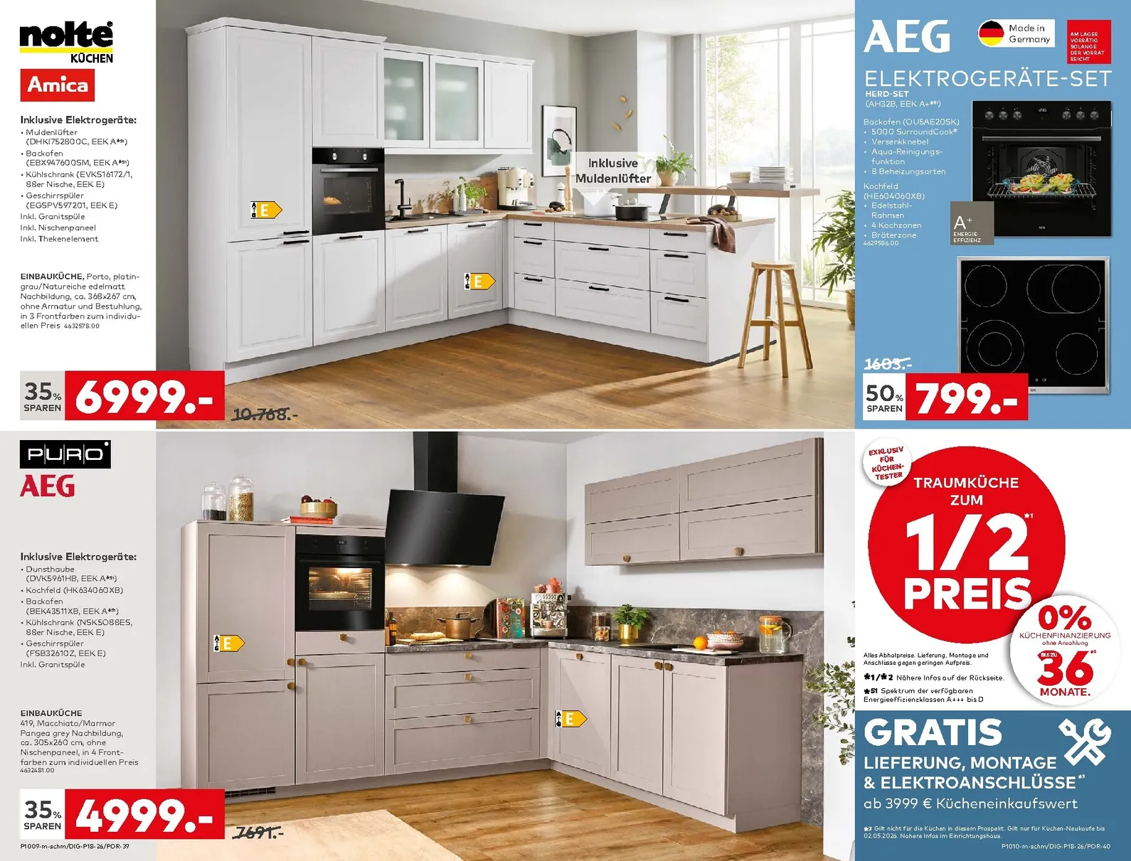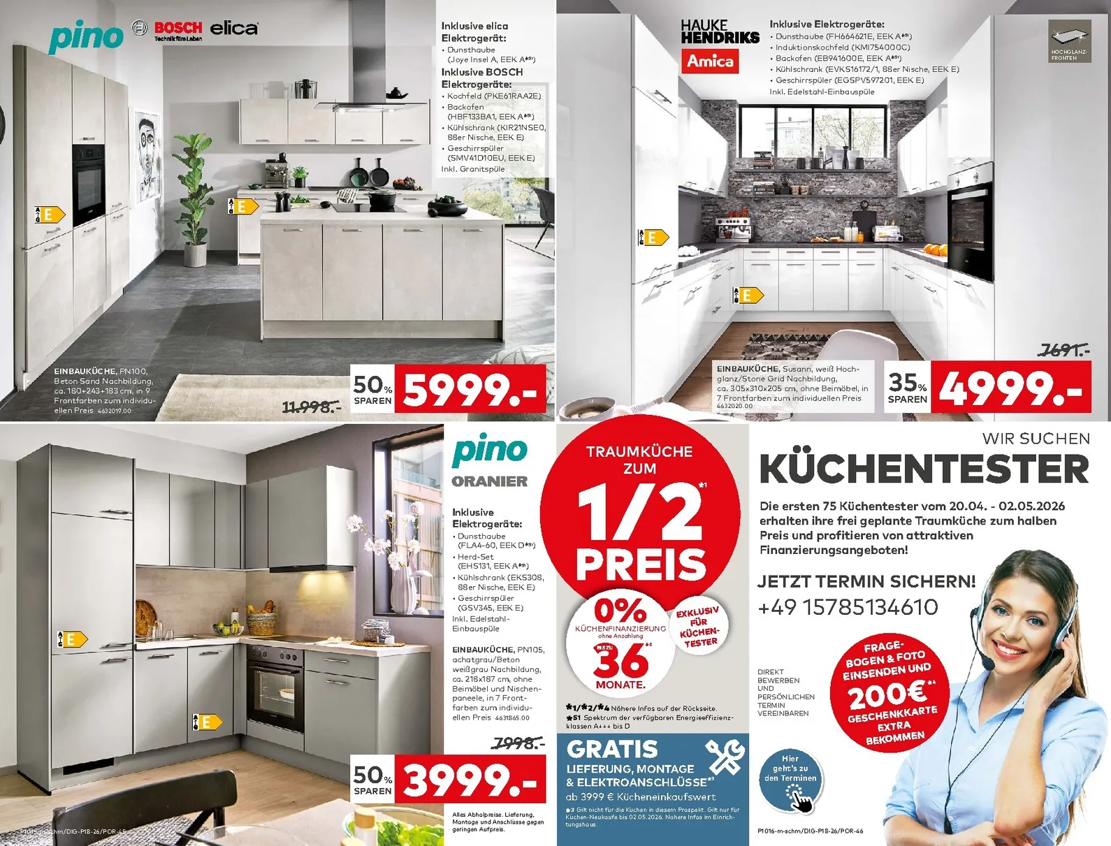 Der Traum von einer neuen Küche wird mit den aktuellen Angeboten von Porta wahr. Die große Küchenaktion ermöglicht den Kauf frei geplanter Küchen zum halben Preis. Somit sind diese Porta Prospekt ab 20.04.2026 die perfekte Gelegenheit, hochwertiges Design zu unschlagbaren Konditionen zu erhalten. Porta unterstützt Ihren Kauf zudem mit einer 0%-Finanzierung über 36 Monate. Ab einem Einkaufswert von 3999 € sind Lieferung, Montage und Elektroanschluss sogar gratis.