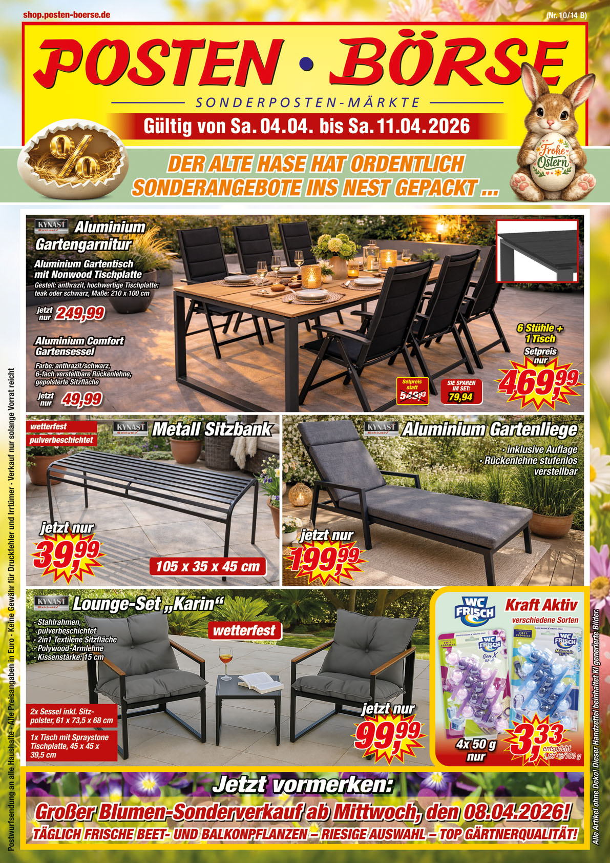 Der Frühling ist da und pünktlich zum Osterfest präsentiert Posten Börse vom 04.04. bis zum 11.04.2026 fantastische Angebote für Garten, Balkon und Terrasse. Unter dem Motto ‚Der alte Hase hat ordentlich Sonderangebote ins Nest gepackt‘ finden Sie alles, um Ihr grünes Paradies zu verschönern. Die aktuellen Posten Börse Prospekt 04.04.2026 – 11.04.2026 Angebote nächste Woche sind besonders attraktiv für alle, die nach hochwertigen Gartenmöbeln suchen. Ein Highlight ist die Aluminium Gartengarnitur ‚Comfort‘ für nur 469,99 €, bestehend aus einem Tisch und sechs Stühlen, die zum Entspannen im Freien einlädt. Wer es gemütlicher mag, findet im wetterfesten Lounge-Set ‚Karin‘ für unschlagbare 99,99 € die perfekte Sitzecke.