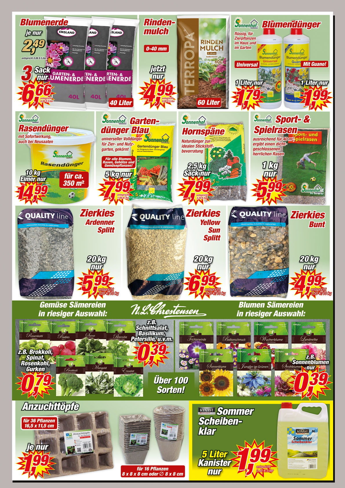 Für die Aussaat im eigenen Garten gibt es eine riesige Auswahl an Gemüse- und Blumensämereien schon ab 0,39 Euro pro Päckchen. Spezialdünger wie Rasendünger oder Hornspäne sorgen für kräftiges Wachstum. Auch praktische Helfer wie der 4er-Pack WC Frisch Kraft Aktiv für 3,33 Euro oder der 5-Liter-Kanister Sommer Scheiben-Klar für 1,99 Euro runden die Angebotspalette ab. Entdecken Sie all diese und viele weitere Schnäppchen im aktuellen Posten Börse Prospekt.
