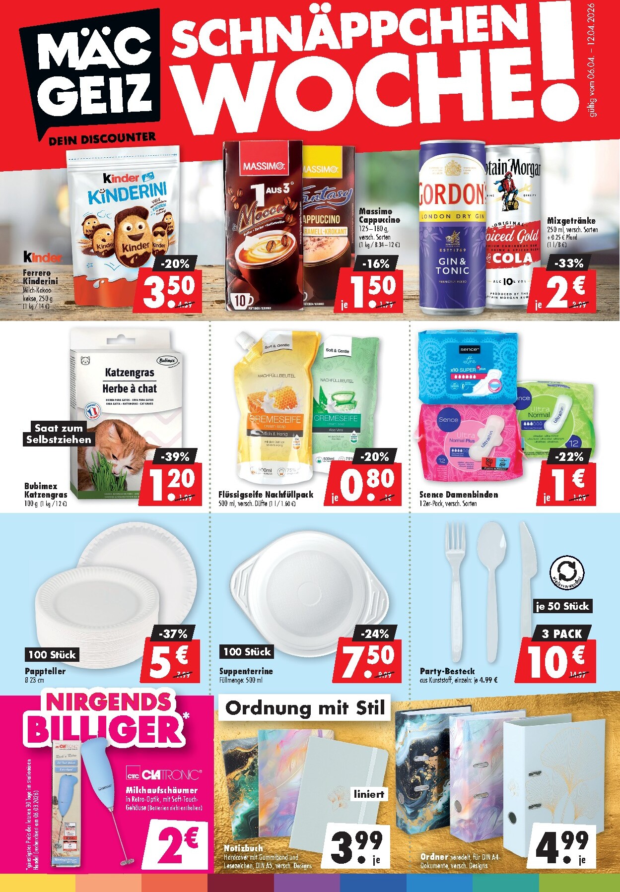 Die neue Woche bei Mac-Geiz steht ganz im Zeichen des Sparens! Vom 6. bis zum 12. April 2026 erwarten Sie unglaubliche Angebote, die Ihren Geldbeutel schonen. Gleich auf der ersten Seite locken Top-Marken zu reduzierten Preisen. Für den süßen Start in den Tag gibt es die Ferrero Kinder Kinderini für nur 3,50 €, ein Rabatt von 20 %. Kaffeeliebhaber freuen sich über den Massimo Cappuccino in verschiedenen Sorten für nur 1,50 €. Und für den gemütlichen Abend sind die Mixgetränke von Gordon’s oder Captain Morgan um 33 % reduziert und kosten nur noch 2 €. Diese Angebote sind ein klarer Beweis dafür, dass die Mac-Geiz Prospekt 06.04.2026 – 12.04.2026 zum Blättern Online Online wieder einmal unschlagbare Deals bereithält.