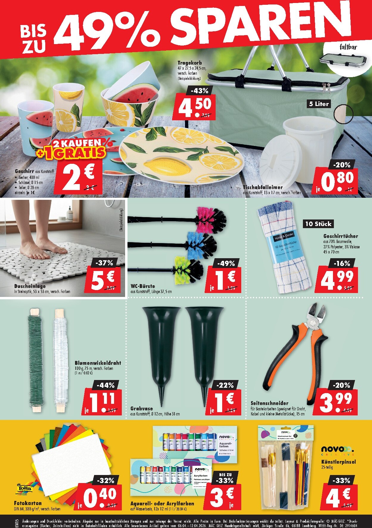 Auch für das Badezimmer und die Reinigung gibt es tolle Angebote, wie die Duschmatte für 5 € oder die WC-Bürste für nur 1 €. Ein 10er-Pack Geschirrtücher ist für 4,99 € zu haben. Hobbygärtner und Bastelfreunde kommen ebenfalls auf ihre Kosten: Ein Seitenschneider für 3,99 €, Künstlerpinsel für 4 € und Aquarell- oder Acrylfarben für 3 € laden zur Kreativität ein. Verpassen Sie diese und viele weitere Angebote nicht und entdecken Sie alle Details im aktuellen Mac-Geiz Prospekt.