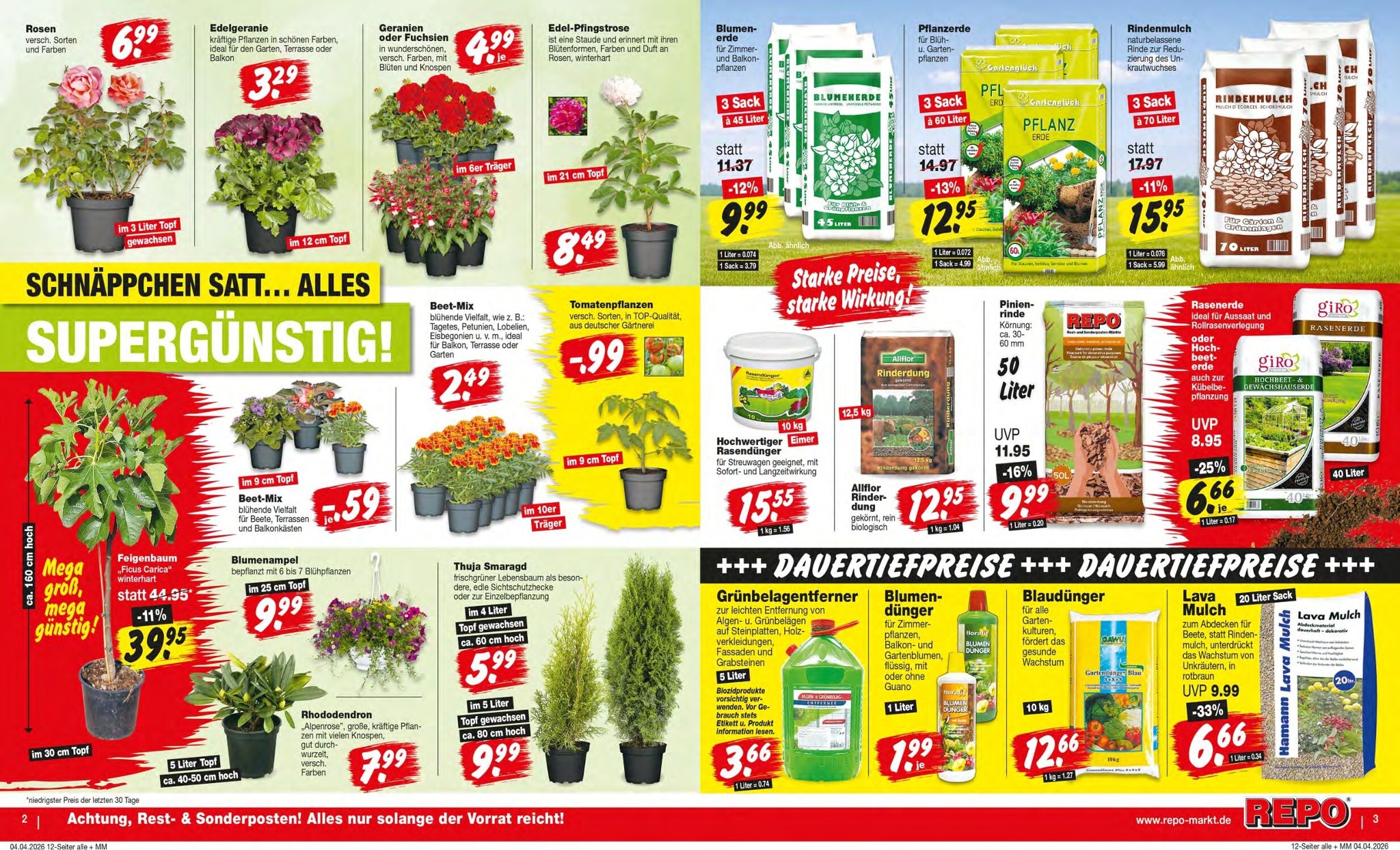 Eine prächtige Blütenvielfalt erwartet Sie in den REPO-Märkten. Wunderschöne Geranien im 11 cm Topf gibt es als Aktionsangebot für nur 1,69 € pro Stück. Auch Edelgeranien, Geranien oder Fuchsien in verschiedenen Farben sind für günstige 3,29 € bzw. 4,99 € im Angebot. Für Rosenliebhaber gibt es verschiedene Sorten im 3-Liter-Topf für nur 6,29 €. Mit dem Repo Prospekt 07.04.2026 – 11.04.2026 Angebote Angebote zum Blättern können Sie Ihren Garten oder Balkon in ein farbenfrohes Blütenmeer verwandeln, ohne dabei Ihr Budget zu sprengen. Thuja Smaragd und Rhododendron runden das Pflanzensortiment ab.