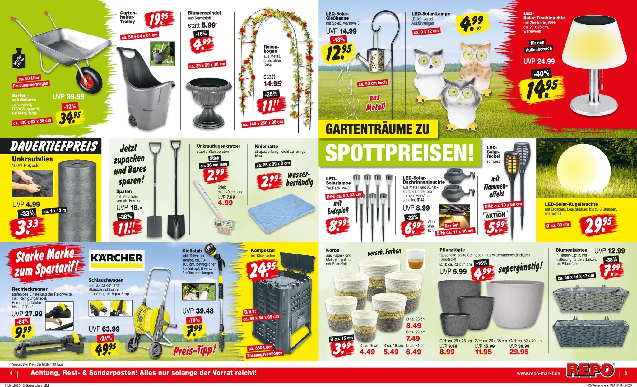 Neben den Pflanzen bietet REPO auch alles Notwendige für deren Pflege. Von hochwertiger Pflanzerde und Rindenmulch in 70-Liter-Säcken für 15,95 € bis hin zu speziellem Rasendünger für einen sattgrünen Rasen. Praktische Helfer wie der Garten-Trolley für 19,95 € oder ein Schlauchwagen-Set von KÄRCHER für 49,95 € erleichtern die Gartenarbeit erheblich. Für eine gemütliche Atmosphäre am Abend sorgen die verschiedenen LED-Solar-Gartenleuchten, die bereits ab 4,99 € erhältlich sind. Schauen Sie sich alle Angebote im Detail im neuesten Repo Prospekt an.