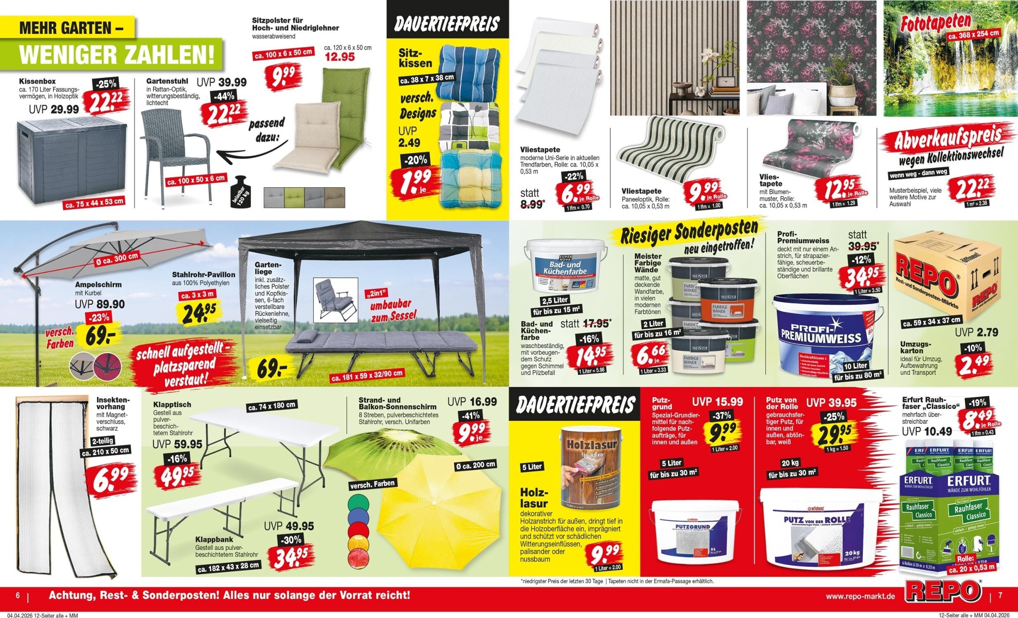 Der Frühling steht vor der Tür und REPO läutet die Gartensaison mit unschlagbaren Angeboten ein. Wer seinen Garten auf Vordermann bringen möchte, findet jetzt die perfekten Helfer zu stark reduzierten Preisen. Das absolute Highlight auf der Titelseite ist das Kärcher Rasen-Trimmer-Set, das statt der unverbindlichen Preisempfehlung von 174,99 € für nur 59,95 € erhältlich ist – eine Ersparnis von beeindruckenden 65 %. Mit diesem leistungsstarken Gerät wird die Rasenpflege zum Kinderspiel. Entdecken Sie im aktuellen Repo Prospekt 07.04.2026 – 11.04.2026 Angebote Angebote zum Blättern viele weitere starke Marken, die REPO jetzt noch günstiger anbietet, um Ihr grünes Paradies zu verschönern.