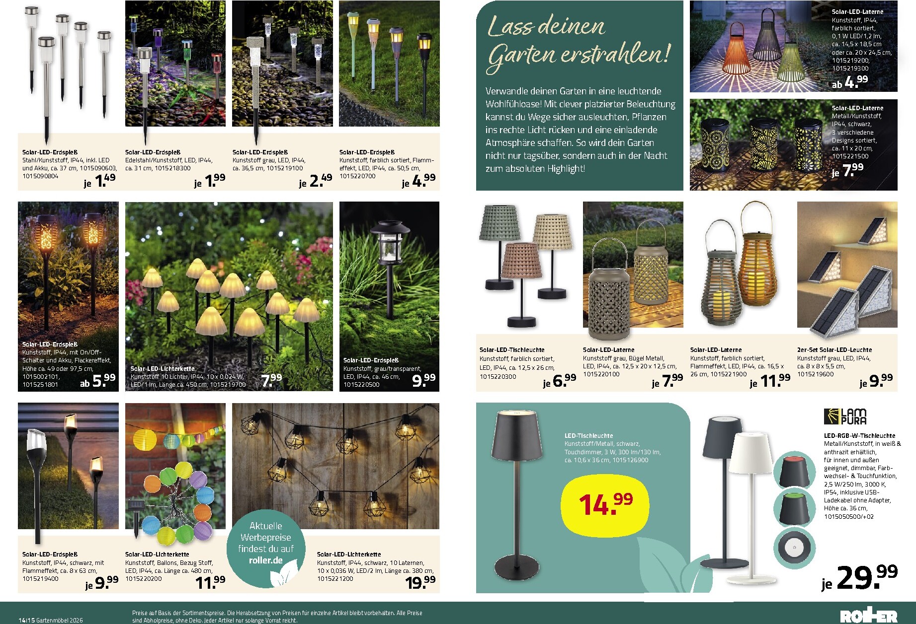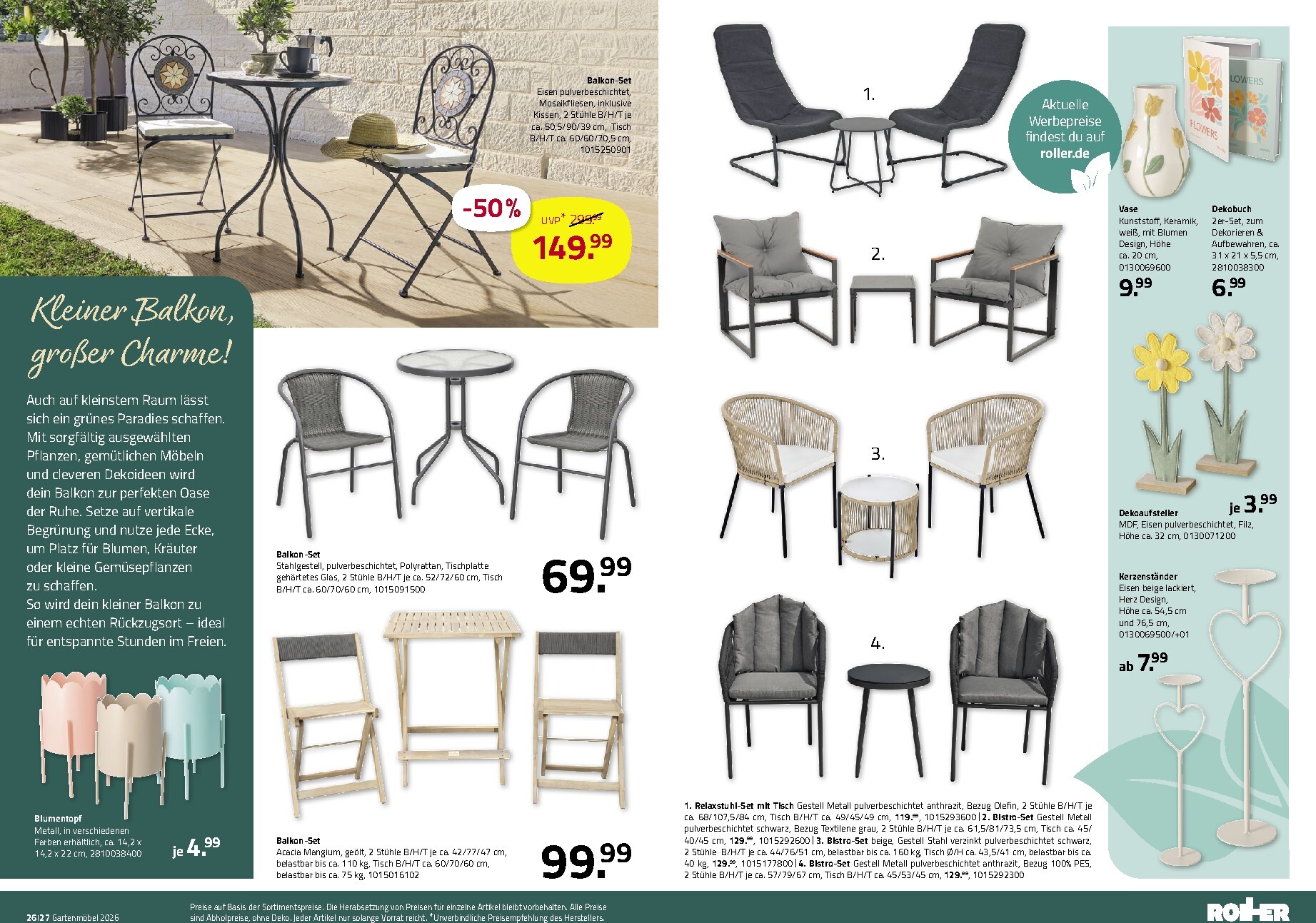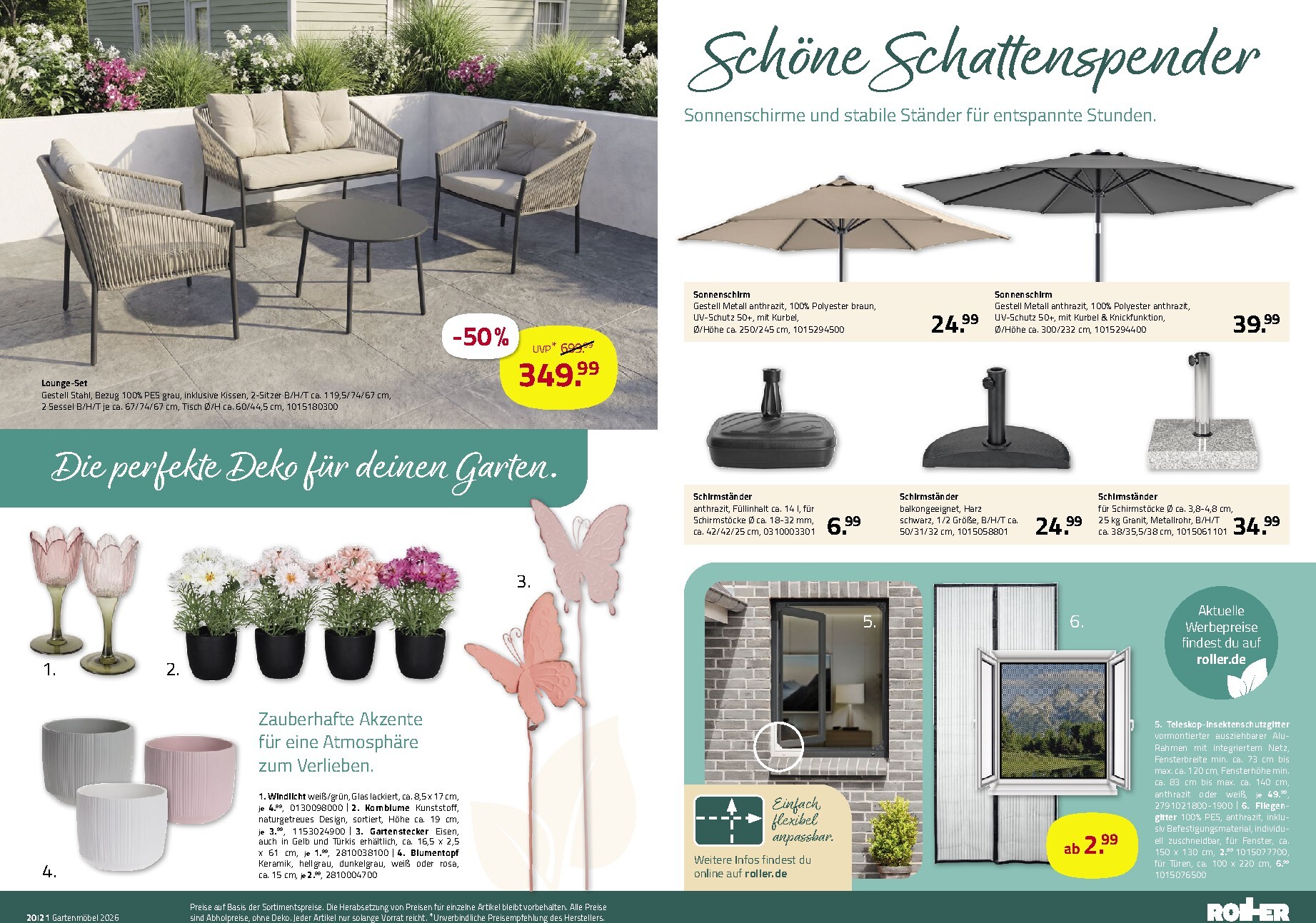 Neben den Sitzmöbeln bietet der Prospekt auch zahlreiche Accessoires, um Ihren Garten perfekt in Szene zu setzen. Ein großer Ampelschirm für nur 79,99 € schützt zuverlässig vor der Sonne und wertet jede Terrasse optisch auf. Für alle, die nach einem echten Schnäppchen suchen, ist das um 50 % reduzierte Lounge-Set für 469,99 € eine ausgezeichnete Wahl. Entdecken Sie die Roller Prospekt 28.09.2026 zum Blättern und gestalten Sie Ihren Außenbereich ganz nach Ihren Wünschen. Stimmungsvolle Akzente setzen Sie mit den Windlichtern in verschiedenen Farben, die es bereits ab 8,99 € gibt, oder mit modernen Pflanzkübeln ab 14,99 €.