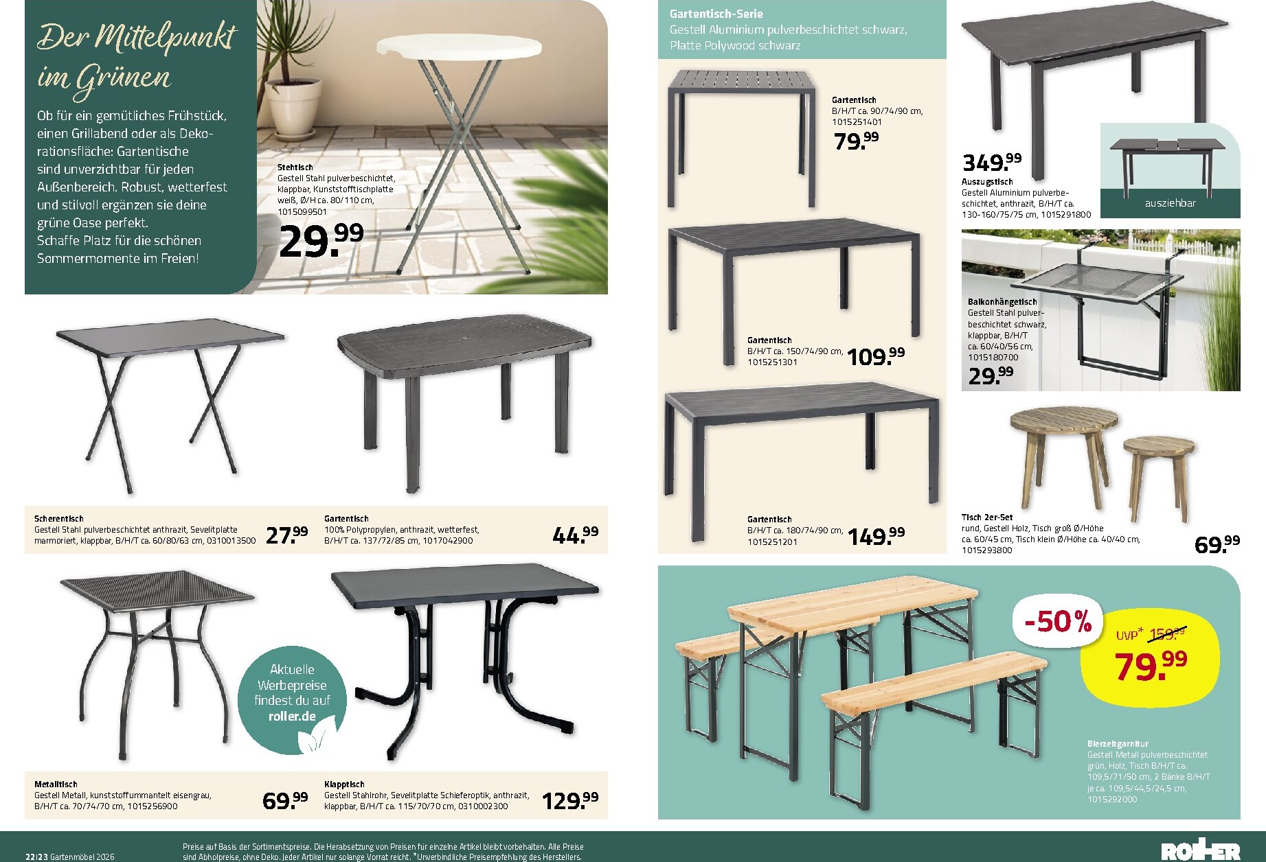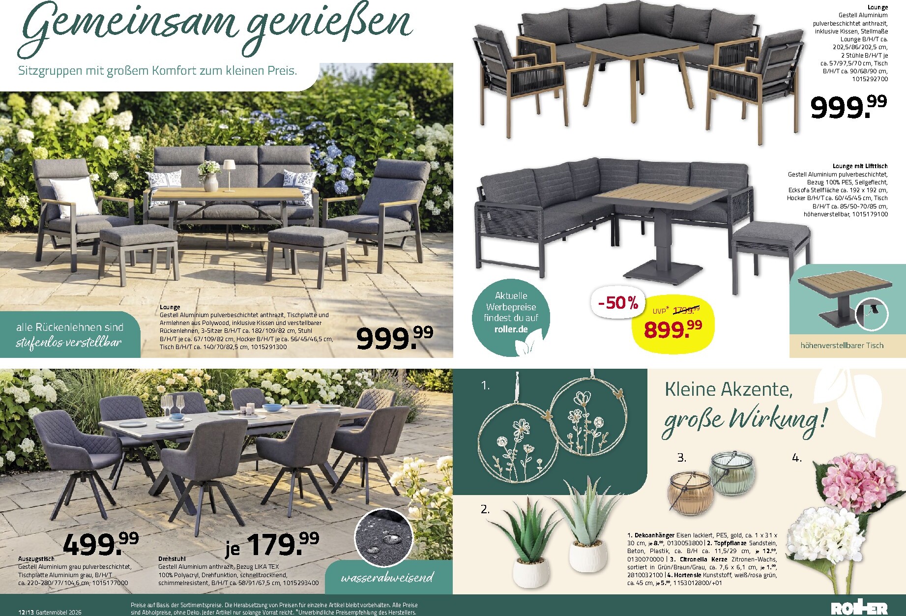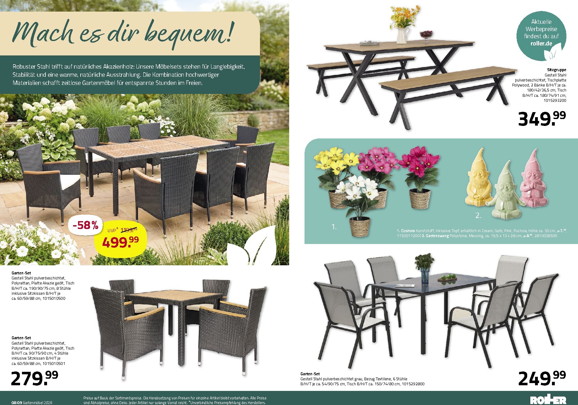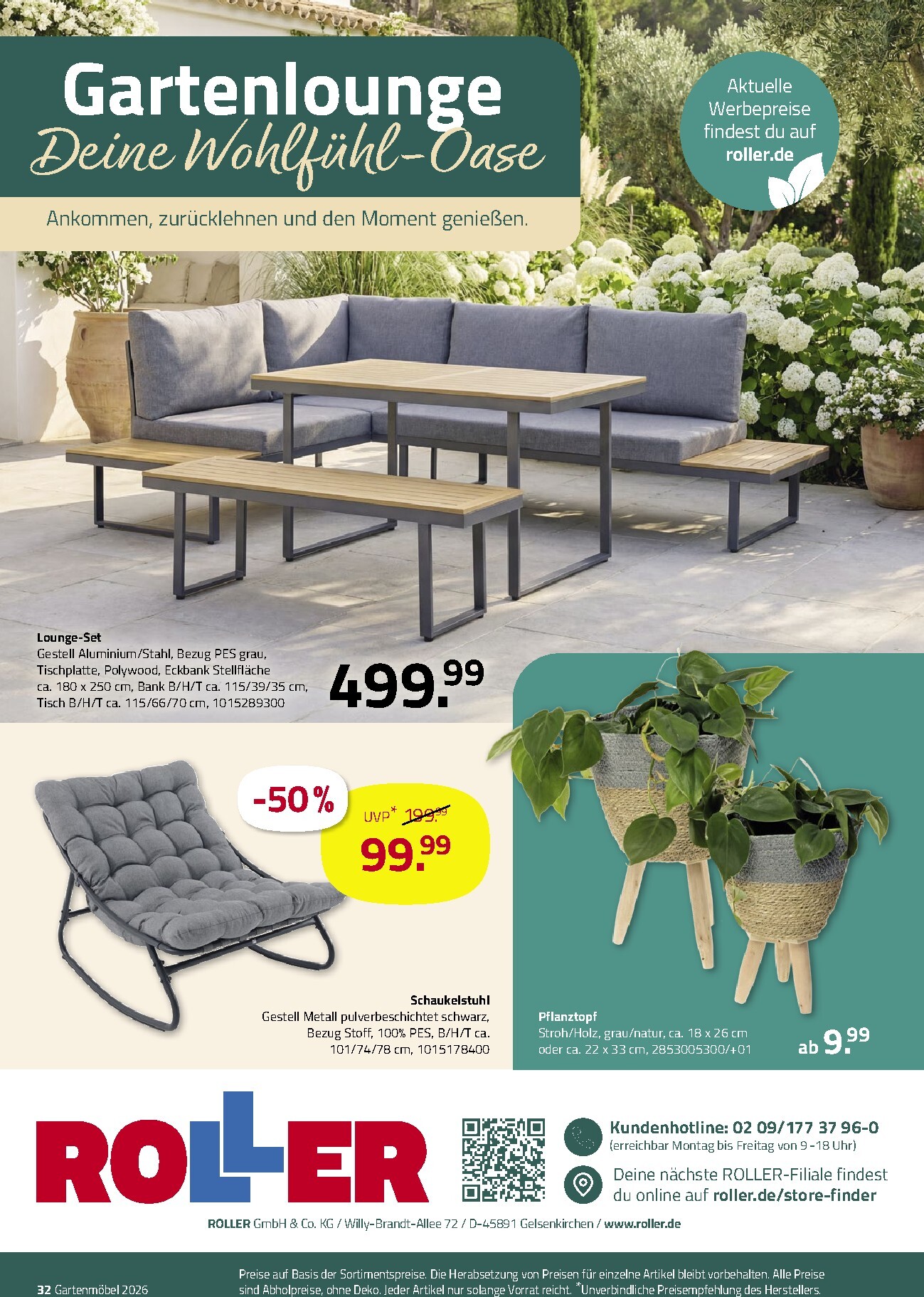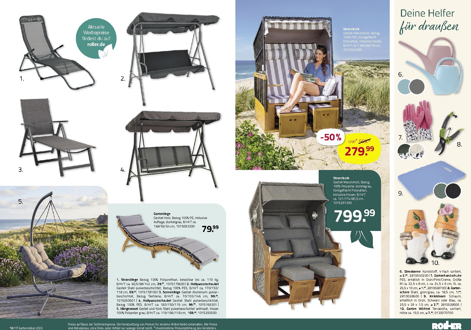 Für ultimative Entspannung sorgt der bequeme Schaukelstuhl, dessen Preis von 199 € auf nur 99,99 € halbiert wurde. Auch für gemeinsame Mahlzeiten im Freien ist gesorgt, beispielsweise mit dem großen Lounge-Set inklusive Tisch und Bänken für 499,99 €. Diese und viele weitere Angebote zeigen, dass stilvolles Outdoor-Wohnen nicht teuer sein muss. Alle Details zu den Materialien, Maßen und weiteren Produkten finden Sie im aktuellen Roller Prospekt.