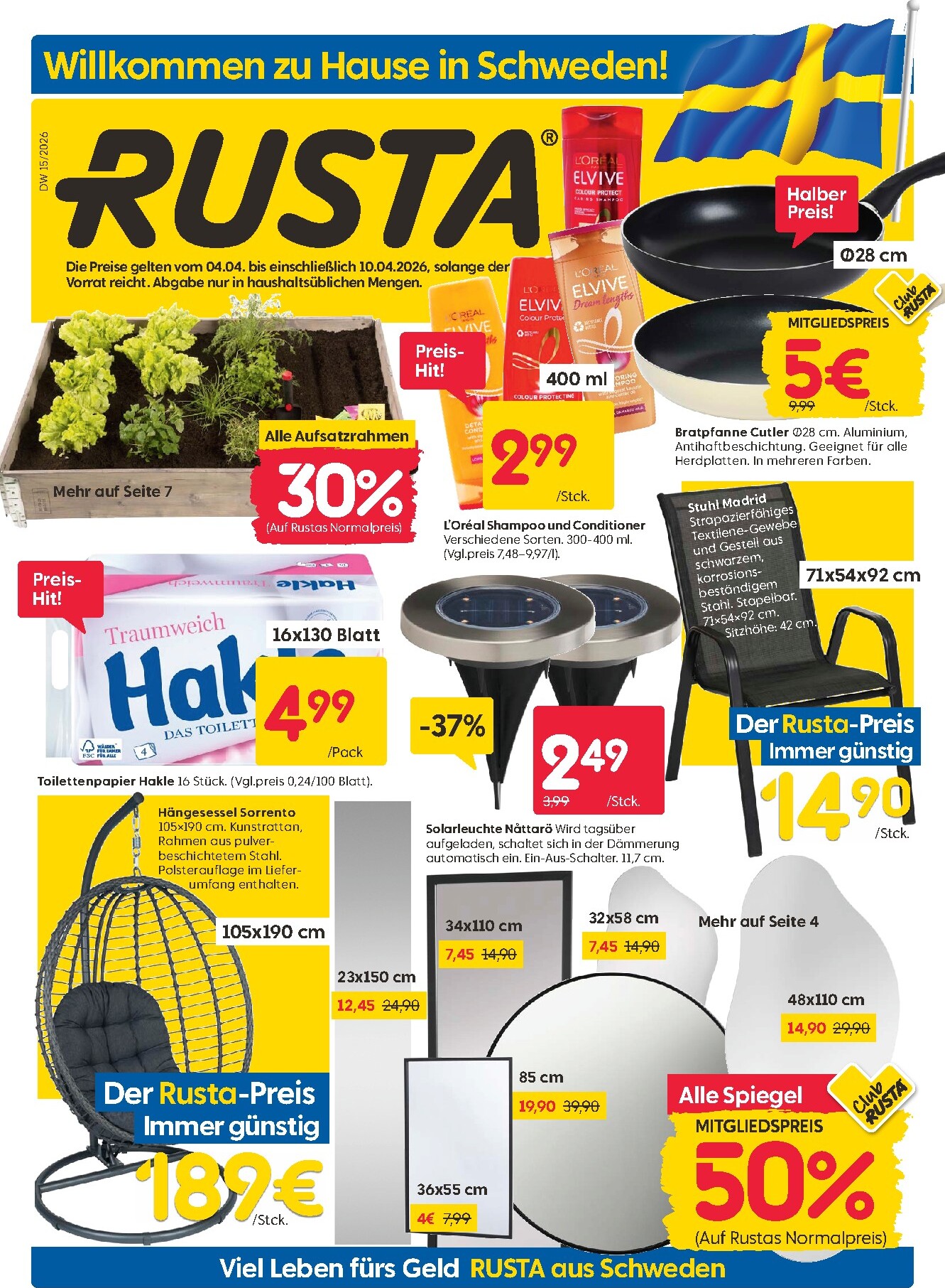 Der Frühling ist da und mit ihm die neuen Angebote von Rusta! Vom 04.04. bis zum 10.04.2026 können Sie Ihr Zuhause und Ihren Garten in eine schwedische Wohlfühloase verwandeln. Die aktuellen Rusta Prospekt 04.04.2026 – 10.04.2026 Angebote nächste Woche bieten fantastische Preise für alles, was das Herz begehrt. Ein absolutes Highlight auf der Titelseite ist der Hängesessel „Sorrento“ für nur 189 €, der zu entspannten Stunden einlädt. Auch für die Schönheit ist gesorgt: L’Oréal Elvive Shampoo oder Spülung erhalten Sie für unschlagbare 2,99 €. Und für den alltäglichen Bedarf gibt es das Hakle Toilettenpapier im 16×130 Blatt Pack für nur 4,99 €.