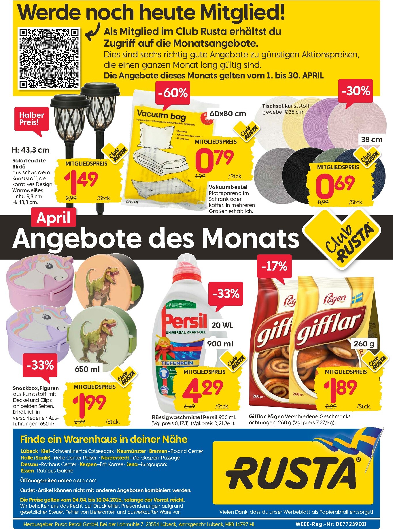 Der April hält zudem besondere Monatsangebote für Club-Mitglieder bereit. Organisieren Sie Ihren Haushalt mit den Vakuumbeuteln für nur 0,79 € oder sorgen Sie für Sauberkeit mit dem Persil Flüssigwaschmittel (900 ml) für 4,29 €. Für den kleinen Hunger zwischendurch gibt es die leckeren Pagen Gifflar für nur 1,89 €. Diese und viele weitere Schnäppchen warten darauf, von Ihnen entdeckt zu werden. Verpassen Sie keine dieser Gelegenheiten und werfen Sie einen detaillierten Blick in den aktuellen Rusta Prospekt.