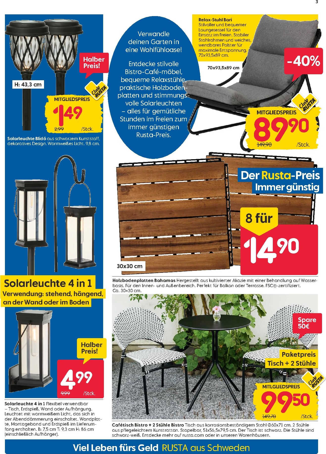 Als Mitglied im Club Rusta profitieren Sie von noch besseren Preisen, wie die Rusta Prospekt 04.04.2026 – 10.04.2026 Angebote nächste Woche eindrucksvoll beweisen. Sichern Sie sich zum Beispiel die antihaftbeschichtete Bratpfanne „Zecira“ (28 cm) für nur 5 € oder sparen Sie 50% auf alle Spiegel. Für pure Entspannung sorgt der Relax-Stuhl „Bari“ für nur 89,90 € statt 149,98 €. Auch die Gartengestaltung wird günstiger: Die Solarleuchte „Blidö“ im dekorativen Design kostet für Mitglieder nur 1,49 €, und das praktische Cafétisch-Set „Bistro“ mit zwei Stühlen ist für 99,50 € erhältlich.