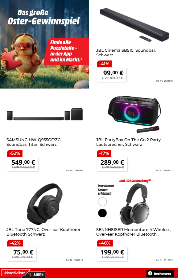 Die Saturn Prospekt 23.03. – 07.04. 2026 zum Blättern Online Online gehen weit über Fernseher und Laptops hinaus und umfassen auch erstklassige Audio-Produkte und Haushaltsgeräte. Verbessern Sie Ihr Klangerlebnis mit der JBL Cinema SB510 Soundbar für nur 99 € oder dem leistungsstarken SAMSUNG HW-Q935GF/ZG Soundbar-System mit 52 % Rabatt. Musikliebhaber freuen sich über die SENNHEISER Momentum 4 Wireless Kopfhörer für 199 € statt 369,90 €. Im Haushaltsbereich glänzen die Waschmaschinen von Bosch und Samsung mit Preisnachlässen von bis zu 55 %, was sie zu einer unschlagbaren Investition für jede Familie macht.