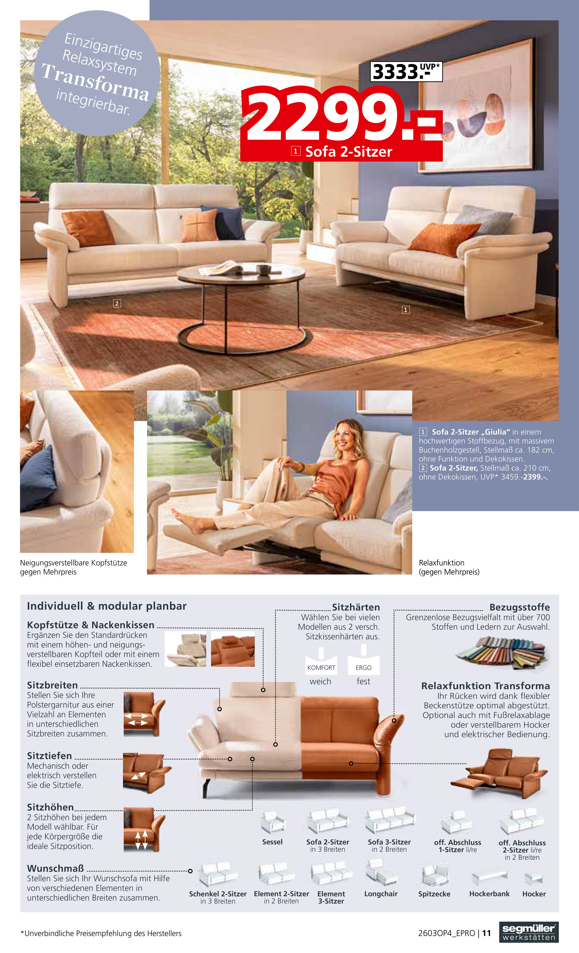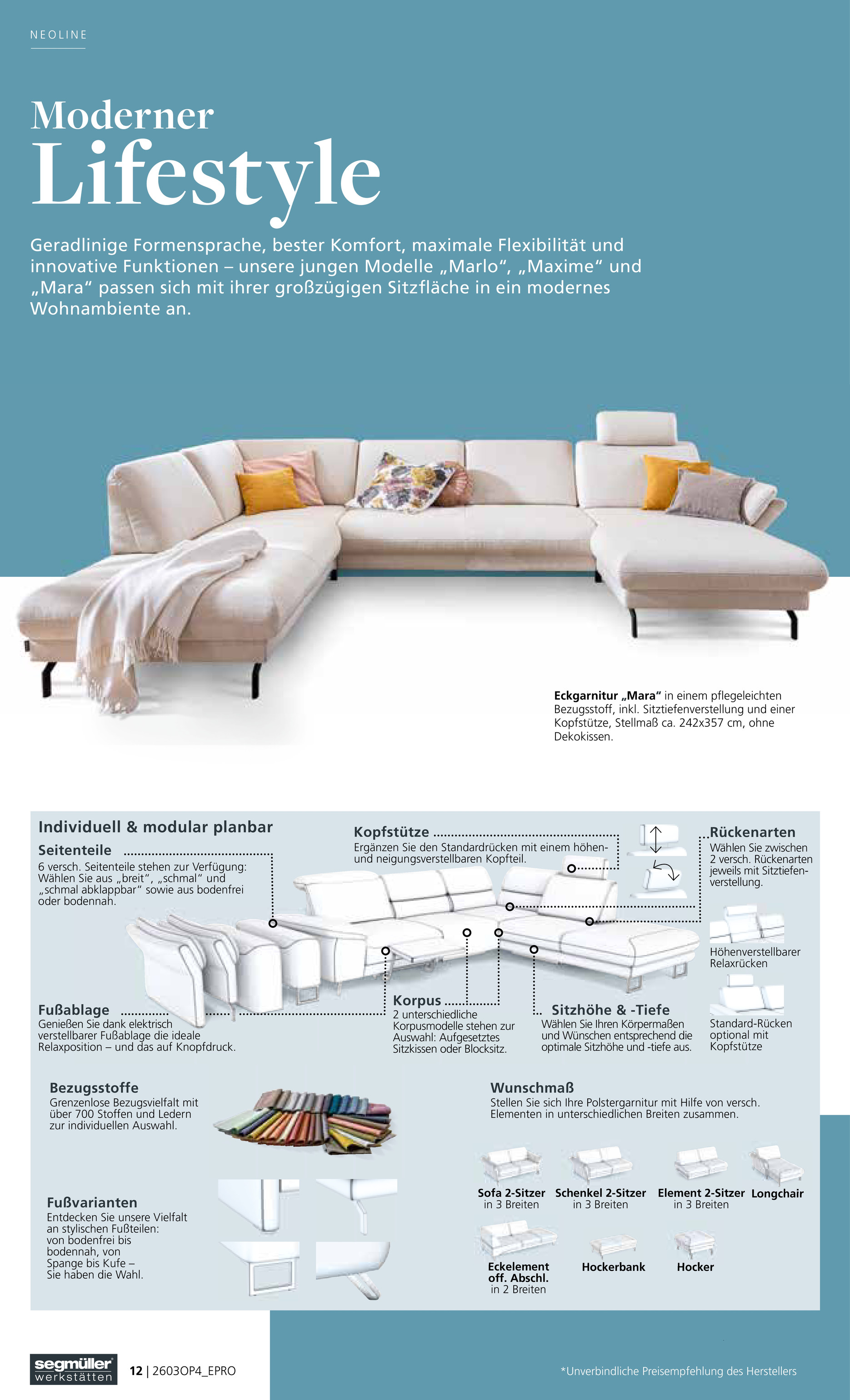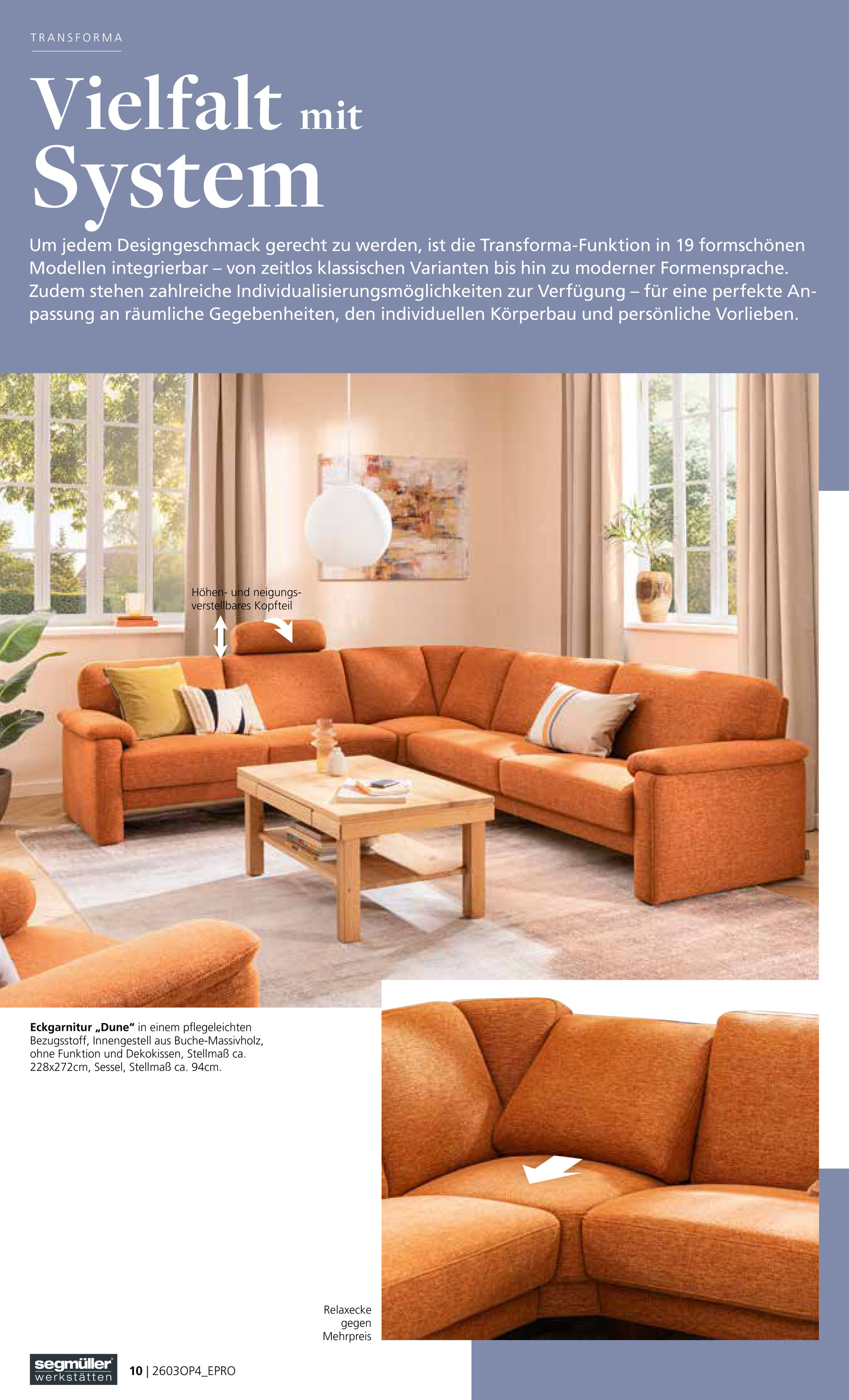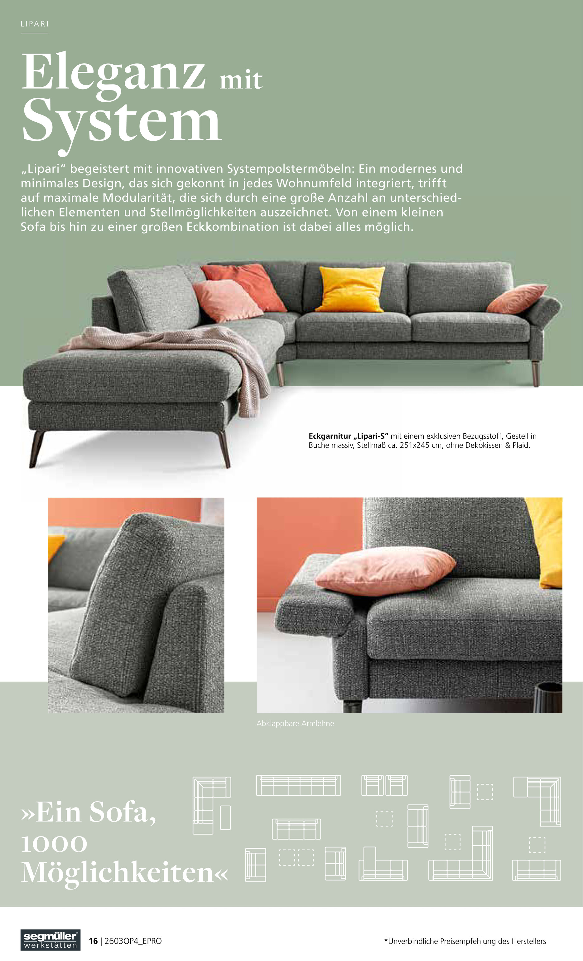 Ein Highlight auf dem Titelblatt ist das elegante 3-Sitzer-Sofa „Denise“, das mit seinem Stellmaß von ca. 281×192 cm und einem Gestell aus Buche-Massivholz überzeugt. Doch das ist nur der Anfang. Der Prospekt widmet sich intensiv den Themen „Gesundes Sitzen mit System Transforma“ und „Nachhaltige Betten“, was den Fokus auf Ergonomie und Wohlbefinden unterstreicht. Segmüller unterstreicht sein Qualitätsversprechen mit einer beeindruckenden 10-Jahres-Garantie auf viele Polstermöbel und 5 Jahre Garantie auf Bezugsstoffe und Leder, sodass Sie sicher sein können, eine nachhaltige Investition zu tätigen.