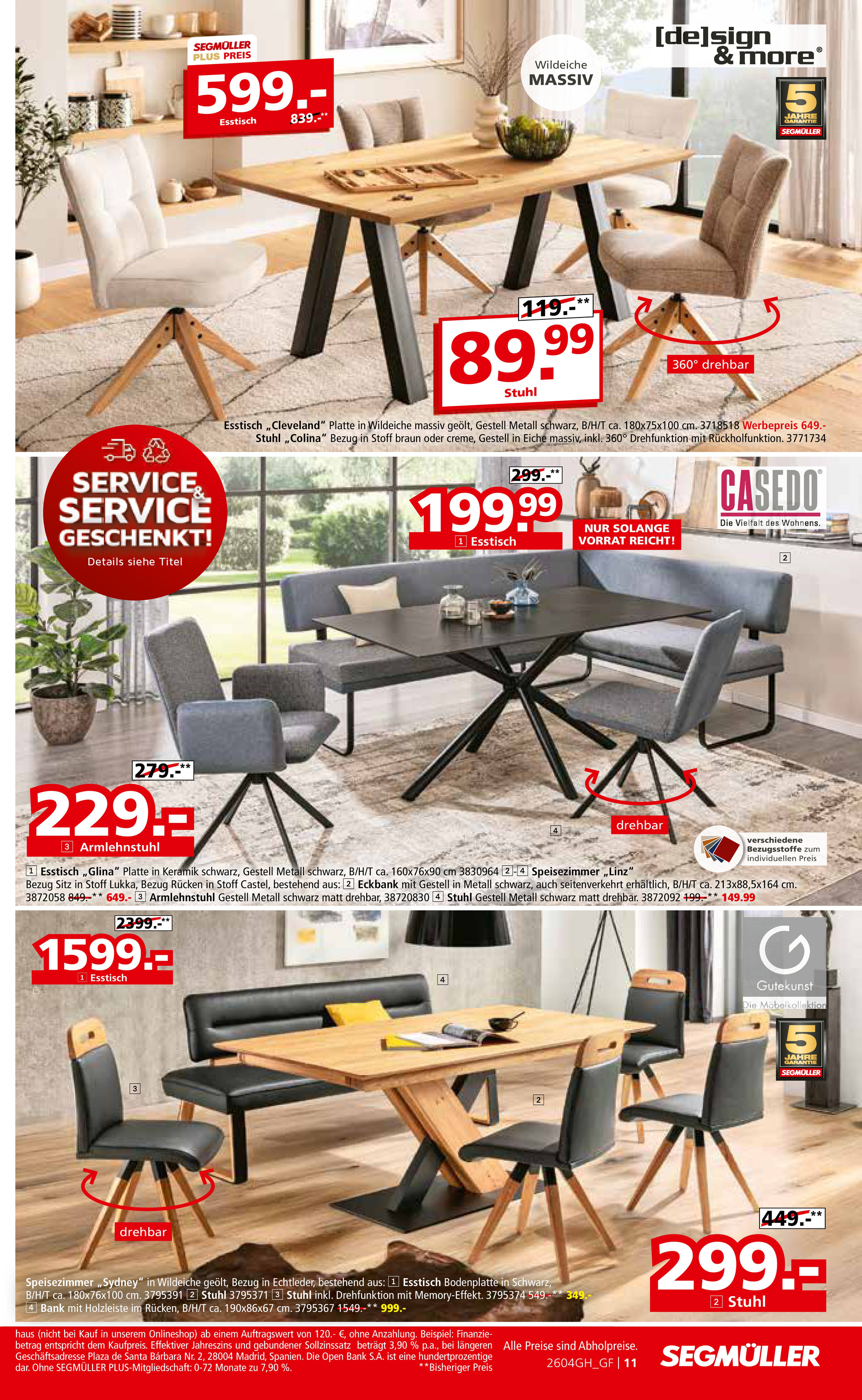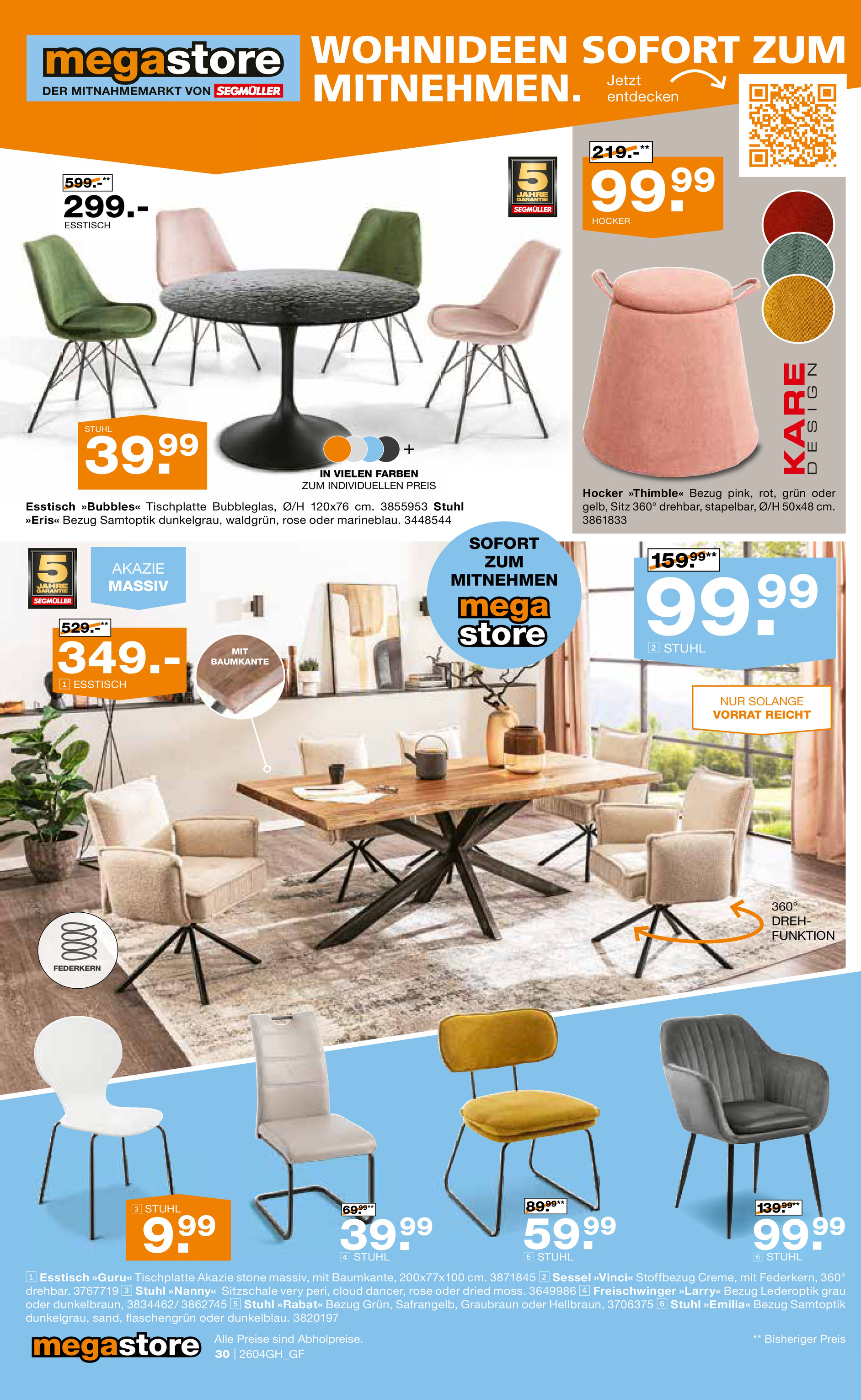 Auch im megastore, dem Mitnahmemarkt von Segmüller, warten tausende Artikel zu sofortigen Tiefpreisen. Gestalten Sie Ihren Essbereich neu mit dem stilvollen Esstisch „Anori“ mit Keramikplatte für nur 249 € oder dem eleganten Stuhl „Vallejo“ für 99,99 €. Wer es besonders günstig mag, findet robuste Stühle bereits ab 29,99 €. Ein weiteres Highlight ist der bequeme Drehstuhl, der für nur 69,99 € statt 119,99 € erhältlich ist und in vielen Farben zur Verfügung steht. Diese und viele weitere Angebote können Sie direkt mit nach Hause nehmen. Entdecken Sie alle Details und Deals im aktuellen Segmüller Prospekt.