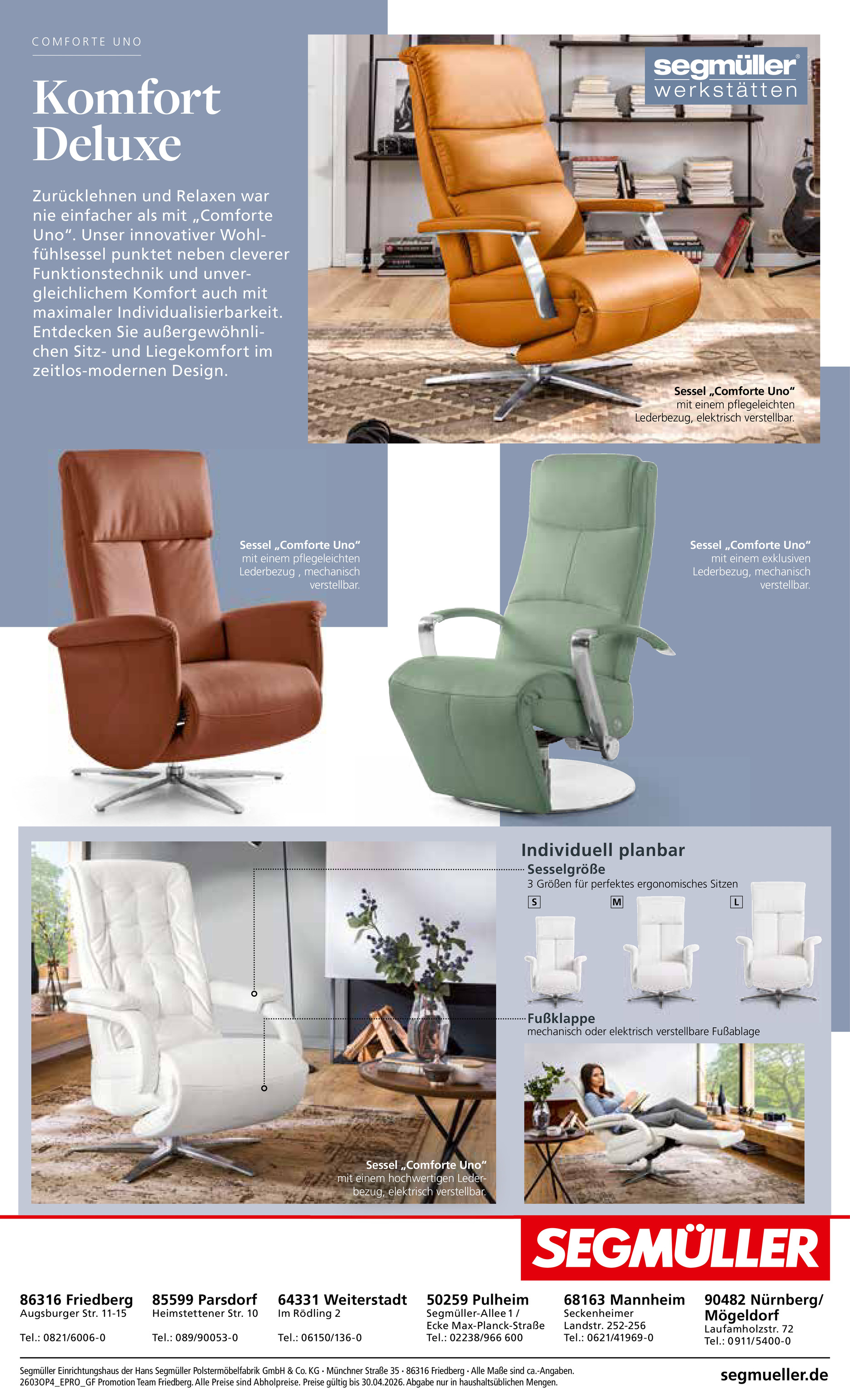 Ein besonderes Highlight für Entspannung und Komfort ist der Sessel „Comforte Uno“. Dieser Wohlfühlsessel punktet mit cleverer Funktionstechnik und unvergleichlichem Sitzkomfort. Er ist in drei verschiedenen Größen (S, M, L) erhältlich, um eine perfekte ergonomische Anpassung zu gewährleisten. Zudem kann zwischen einer mechanisch oder elektrisch verstellbaren Fußauflage gewählt werden, um die ideale Relaxposition zu finden. Die große Auswahl an hochwertigen Lederbezügen rundet das Angebot ab und macht den Sessel zu einem individuellen Schmuckstück. Entdecken Sie alle Details und weitere Angebote im aktuellen Segmüller Prospekt.