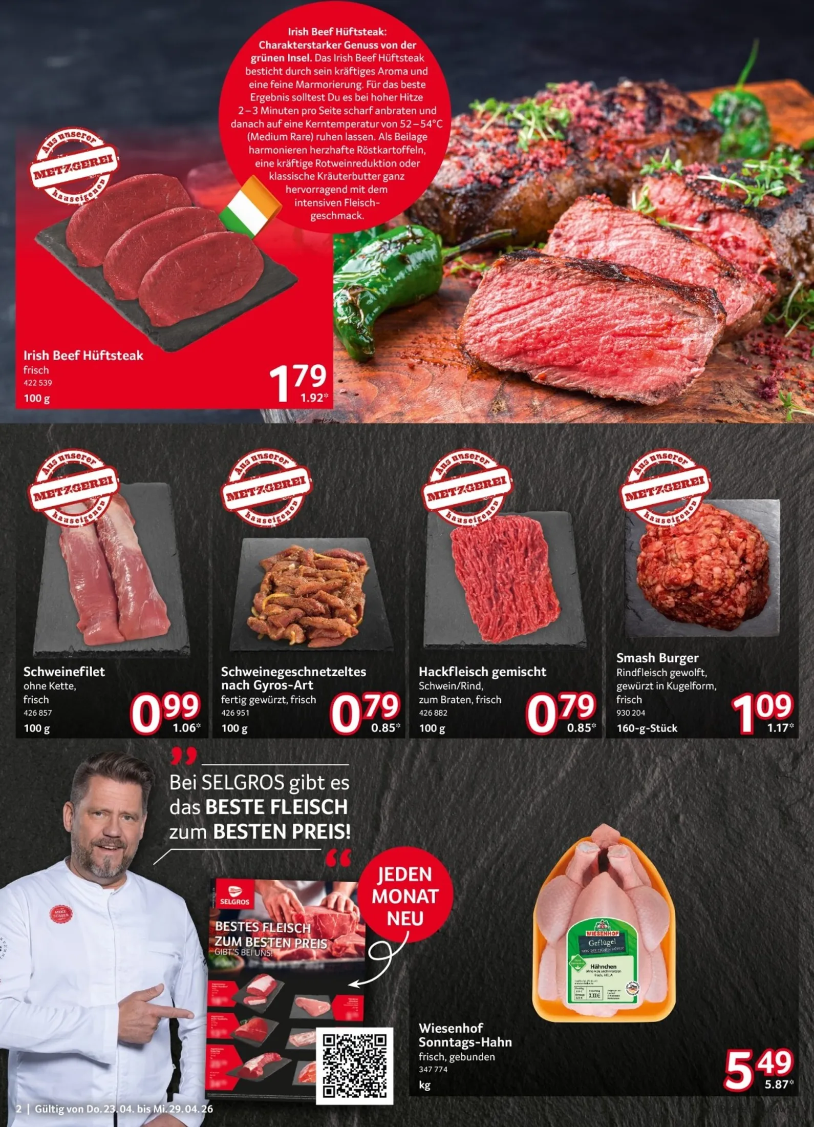 Vom 23. bis 29. April 2026 bietet Selgros wieder exklusive Angebote für Profis und Genießer. Die Metzgereiabteilung überzeugt mit zartem Irish Beef Hüftsteak für 1,79 € je 100 g oder magerem Schweinefilet für nur 0,99 € je 100 g. Diese Auswahl ist ideal für die gehobene Küche. Wer Inspiration für besondere Menüs sucht, findet hier die besten Zutaten. Das aktuelle Selgros Prospekt ab 23.04.2026 zeigt eindrucksvoll die Vielfalt und Qualität.