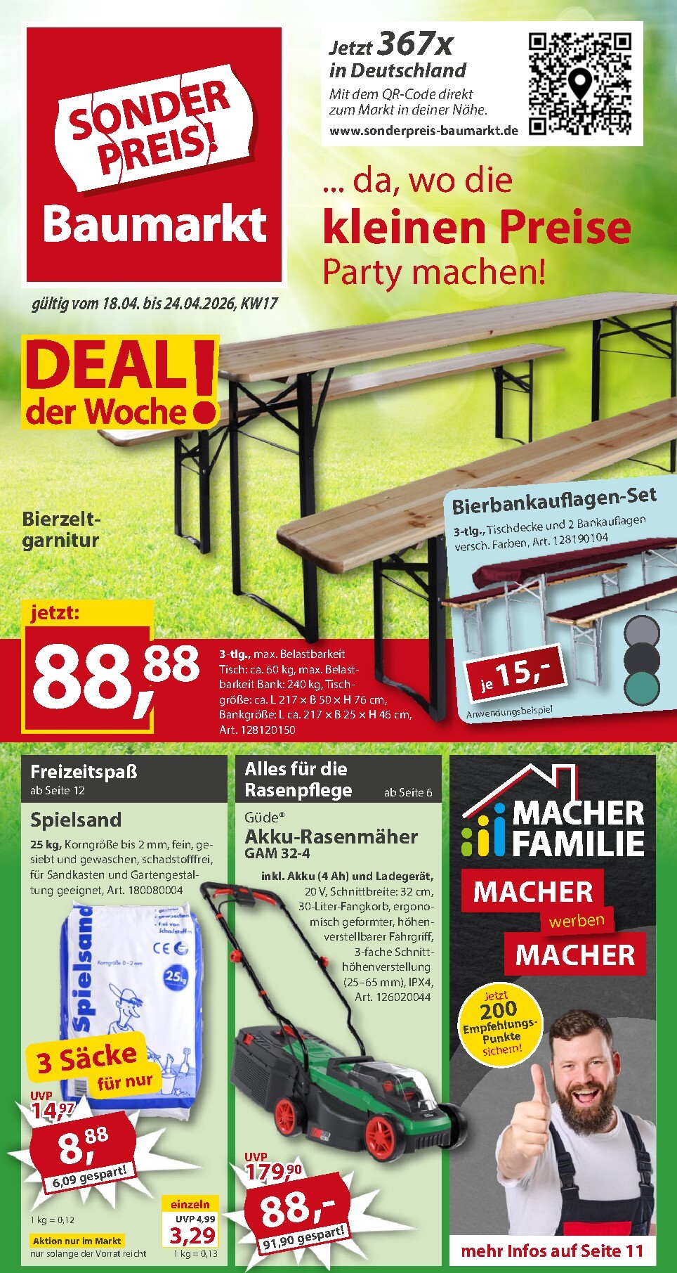 Der Frühling ist da und Sonderpreis Baumarkt feiert mit dem Motto ‚… da, wo die kleinen Preise Party machen!‘. Vom 18.04. bis zum 24.04.2026 erwarten Sie unschlagbare Angebote für Projekte im Freien. Das Highlight der Woche ist die 3-teilige Bierzeltgarnitur für nur 88,88 €, perfekt für die nächste Gartenparty. Wer auf der Suche nach den besten Deals ist, wird in diesem Sonderpreis Baumarkt Prospekt 18.04.2026 – 24.04.2026 Angebote Angebote zum Blättern fündig. Für die Kleinsten gibt es drei Säcke Spielsand (je 25 kg) im Paket für nur 8,88 €, was einem sensationellen Kilopreis von nur 0,13 € entspricht.