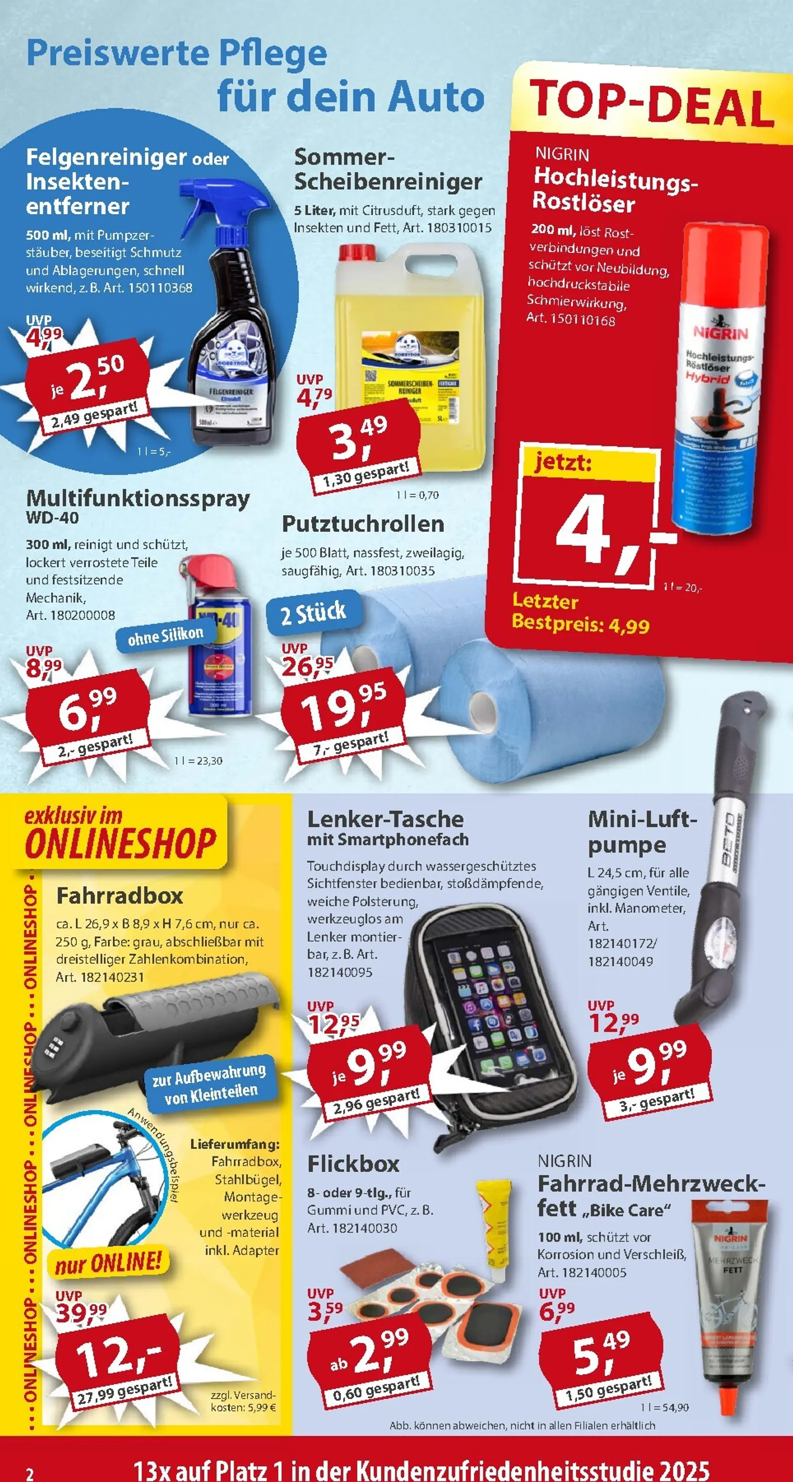 Für die Pflege Ihres Fahrzeugs bietet der Prospekt eine breite Palette an Produkten. Vom Felgenreiniger über Multifunktionsspray bis zu Putztuchrollen ist alles dabei, um Auto und Fahrrad auf Hochglanz zu bringen. Auch an die Sicherheit wurde gedacht: Sicherheitswesten und Verbandkästen sind zu kleinen Preisen erhältlich. Für Radfahrer gibt es zudem praktische Fahrradboxen und Flick-Sets, damit die nächste Tour pannenfrei verläuft. Die Angebote decken jeden Bedarf ab.