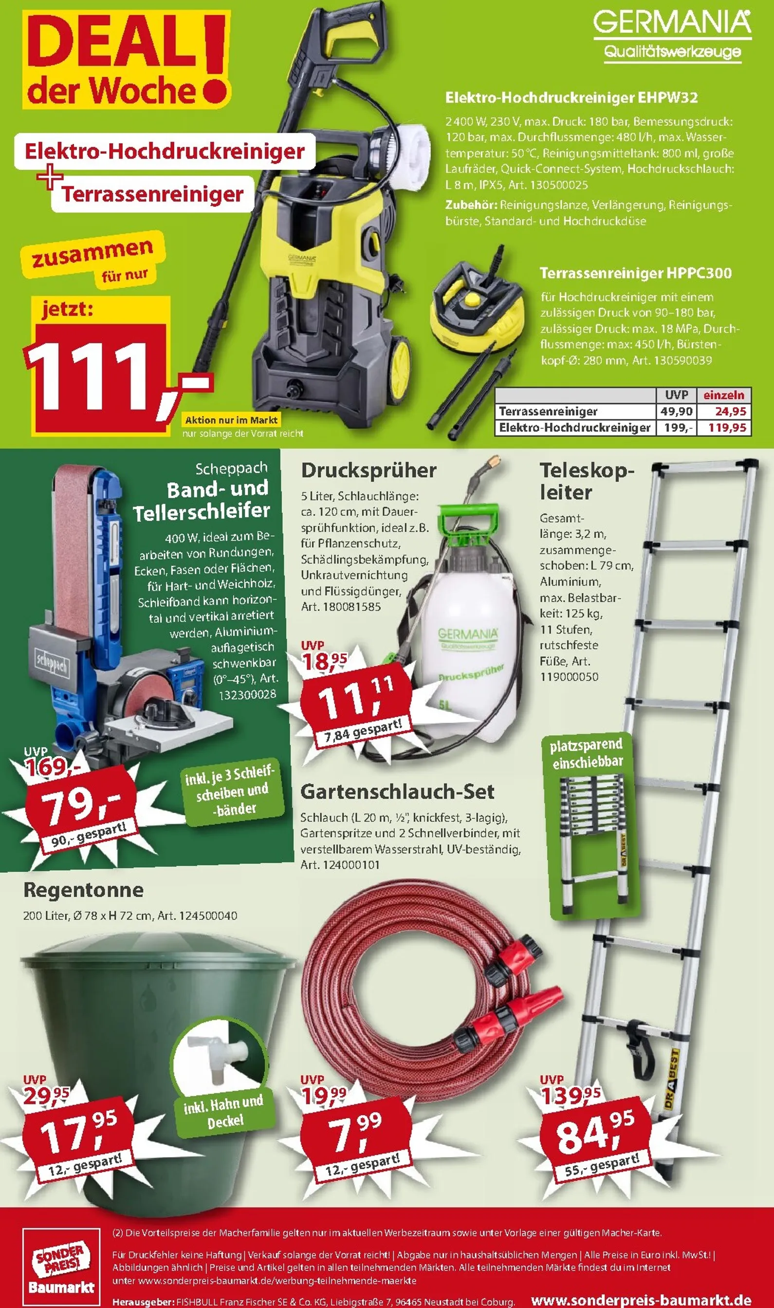 Heimwerker sollten einen Blick auf die Deals der nächsten Woche werfen. Ein leistungsstarker Elektro-Hochdruckreiniger für nur 111 Euro erleichtert die Reinigung von Terrassen erheblich. Wer Wasser sparen möchte, greift zur 200-Liter-Regentonne für 17,95 Euro. Alle Details finden Sie im aktuellen Sonderpreis Baumarkt Prospekt. Nutzen Sie die Gelegenheit, denn die Sonderpreis Baumarkt Prospekt ab 25.04.2026 sind die perfekte Chance, um bei Ihren Projekten kräftig zu sparen.