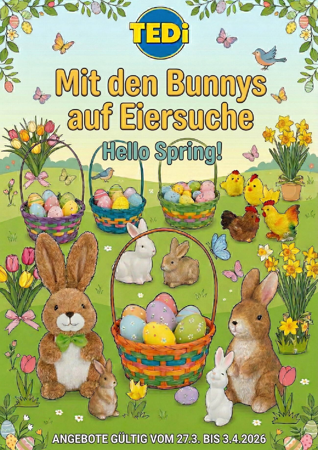 Der Frühling ist da und TEDi begrüßt die schönste Jahreszeit mit zauberhaften Angeboten, die Lust auf Ostern machen. Unter dem Motto „Mit den Bunnys auf Eiersuche“ finden Sie alles, um Ihr Zuhause festlich zu schmücken und die perfekte Eiersuche vorzubereiten. Die aktuellen TEDi Prospekt 27.03.2026 – 03.04.2026 Blätterkatalog stecken voller Inspiration für Dekoration, Bastelbedarf und kleine Geschenke, die Herzen von Groß und Klein höherschlagen lassen. Tauchen Sie ein in eine Welt voller bunter Farben und niedlicher Motive, die den Winter endgültig vertreiben und die Vorfreude auf das Osterfest wecken.