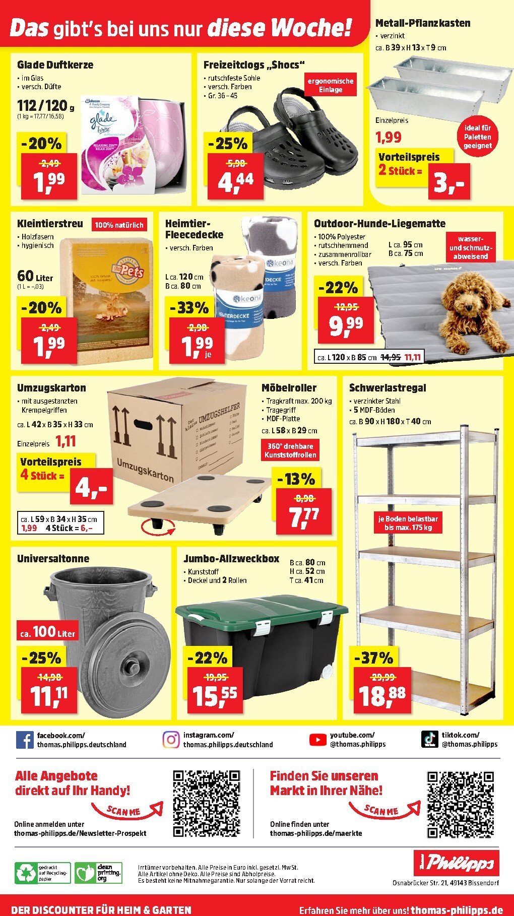 Neben den Gartenartikeln hält der Prospekt auch zahlreiche praktische Helfer für Haushalt und Werkstatt bereit. Schaffen Sie Ordnung mit dem robusten Schwerlastregal, das mit einem Rabatt von 37% für nur 18,88 Euro erhältlich ist. Jeder der fünf Böden ist mit bis zu 175 kg belastbar. Für Lagerung und Transport eignen sich die Jumbo-Allzweckbox für 15,55 Euro oder die Umzugskartons im 4er-Vorteilspack für nur 4,- Euro. Diese Woche bietet der Thomas Phillips Prospekt 07.04.2026 – 11.04.2026 zum Blättern Online Online clevere Lösungen, um den Alltag zu organisieren und dabei kräftig zu sparen.