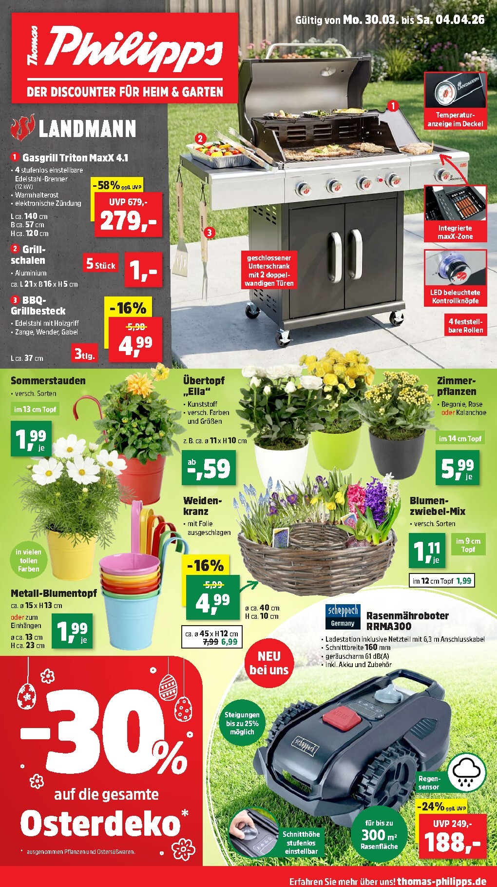 Neben den Grillangeboten bringt Thomas Philipps auch Farbe in Ihr Zuhause und Ihren Garten. Entdecken Sie im Thomas Phillips Prospekt 30.03.2026 – 04.04.2026 Angebote Angebote zum Blättern eine große Auswahl an Pflanzen, um Balkon und Beete zu verschönern. Sommerstauden im 13-cm-Topf gibt es für je 1,99 Euro, und Zimmerpflanzen wie Begonien oder Rosen im 14-cm-Topf für je 5,99 Euro. Ein besonderes Highlight für Technikfreunde ist der neue Scheppach Rasenmähroboter RRMA300 für Rasenflächen bis zu 300 m², der jetzt für nur 188,- Euro statt 249,- Euro erhältlich ist.