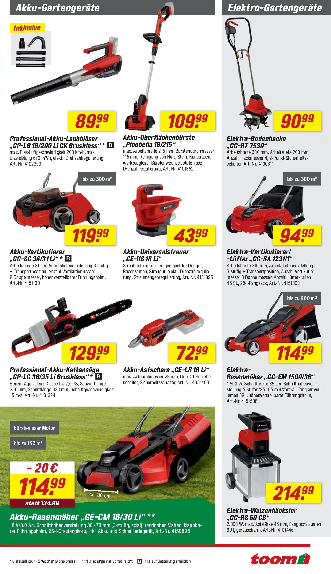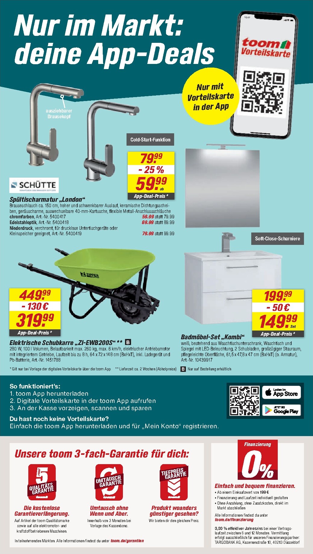 Exklusive Vorteile warten in der toom App auf Sie. Sichern Sie sich zum Beispiel die SCHÜTTE Spültischarmatur „London“ mit Cold-Start-Funktion für nur 59,99 € statt 79,99 € oder das moderne Badmöbel-Set „Kombi“ für nur 149,99 € statt 199,99 €. Für die Rasenpflege ist das Einhell Akku-Rasenmäher-Set „GE-CM 43 Li M“, exklusiv bei toom, für 419,99 € ein echtes Kraftpaket. Diese und viele weitere Angebote für Ihr Projekt finden Sie im aktuellen toom Prospekt.