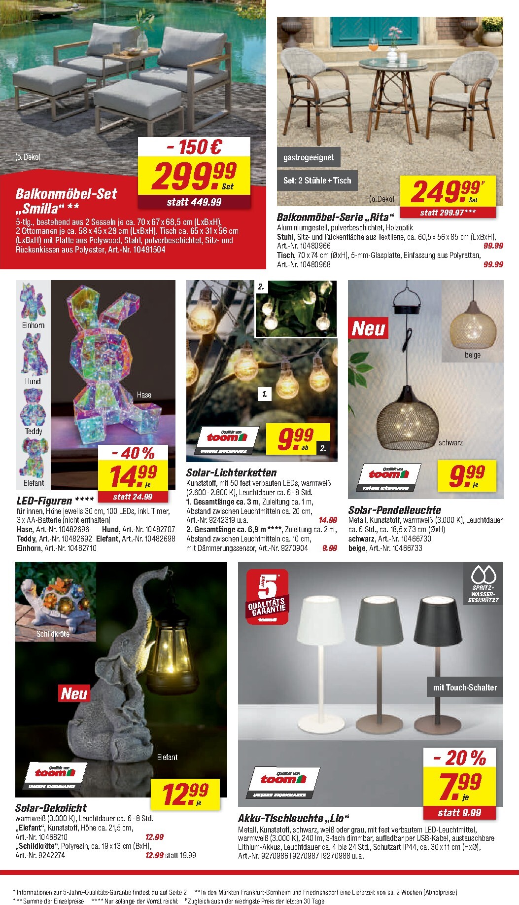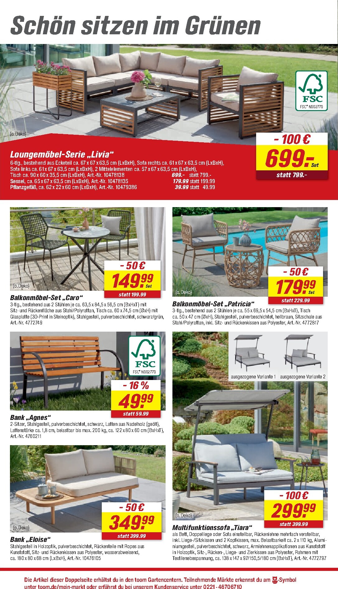 Auch für kleinere Außenbereiche hat toom die passenden Lösungen parat. Das elegante Balkonmöbel-Set „Boho“ mit zwei Stühlen und einem Tisch ist für nur 149,99 € statt 229,99 € erhältlich und schafft eine gemütliche Atmosphäre. Wer es flexibel mag, wird das Multifunktionssofa „Pippa“ für 249,99 € lieben, das sich vielseitig an Ihre Bedürfnisse anpasst. Der aktuelle toom Prospekt 04.04.2026 – 10.04.2026 Frühlingsfreude zu Ostern. Angebote Angebote zum Blättern präsentiert zudem das 5-teilige Gartenmöbel-Set „Anouk“ für 299,99 €, bestehend aus zwei Sesseln, einem Sofa und einem Tisch – ideal für gesellige Runden mit Familie und Freunden. Für alle, die es noch großzügiger mögen, bietet das Gartenmöbel-Set „Lara“ für 899 € Platz und Komfort auf höchstem Niveau.