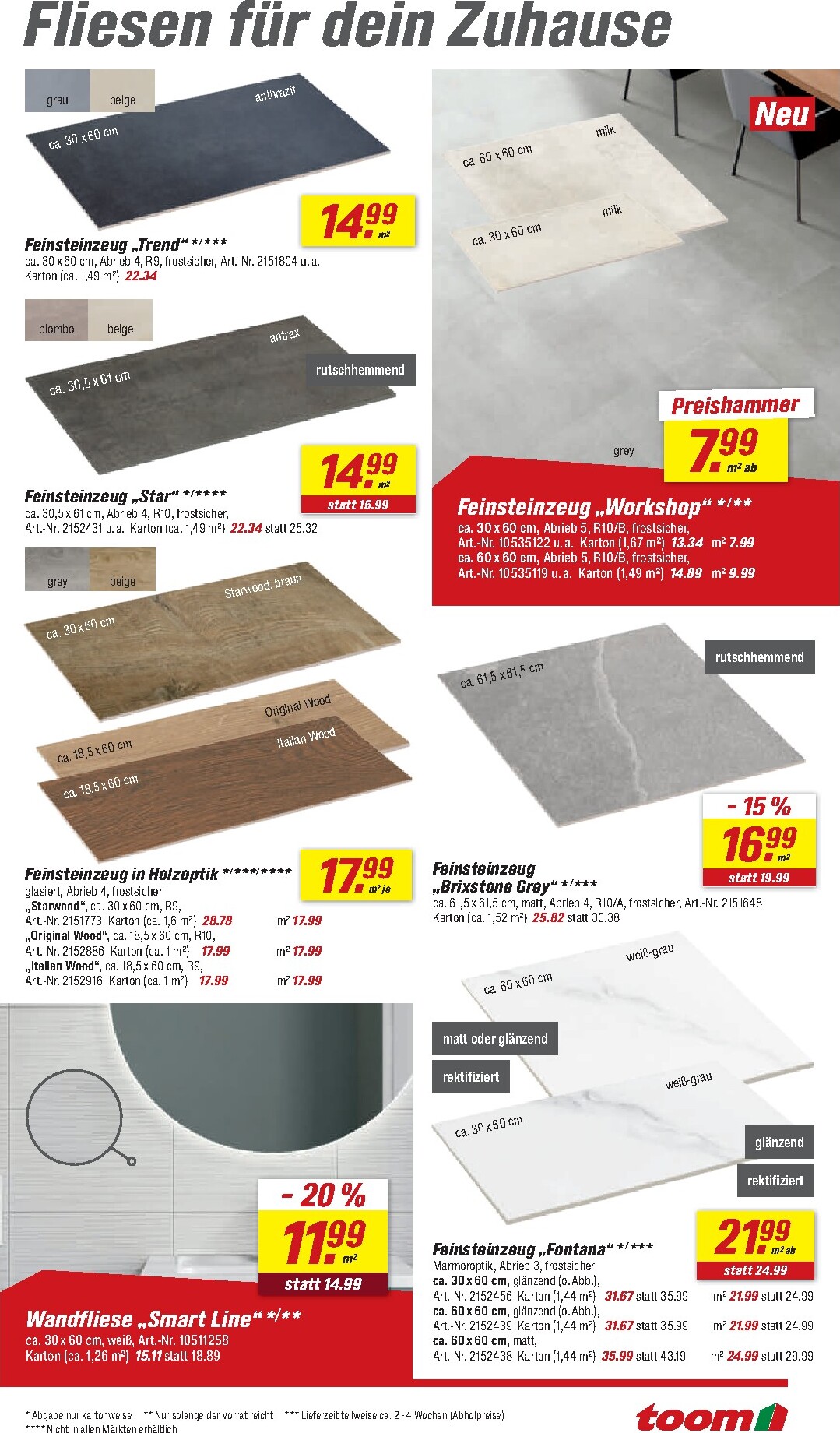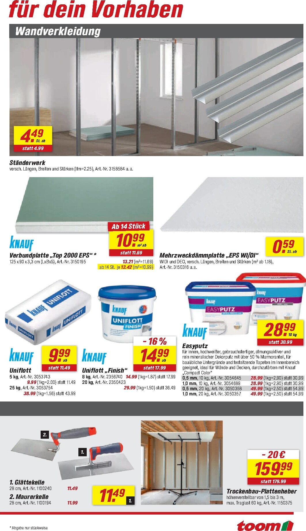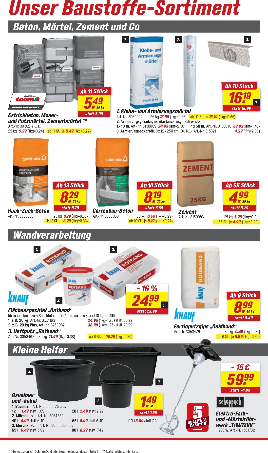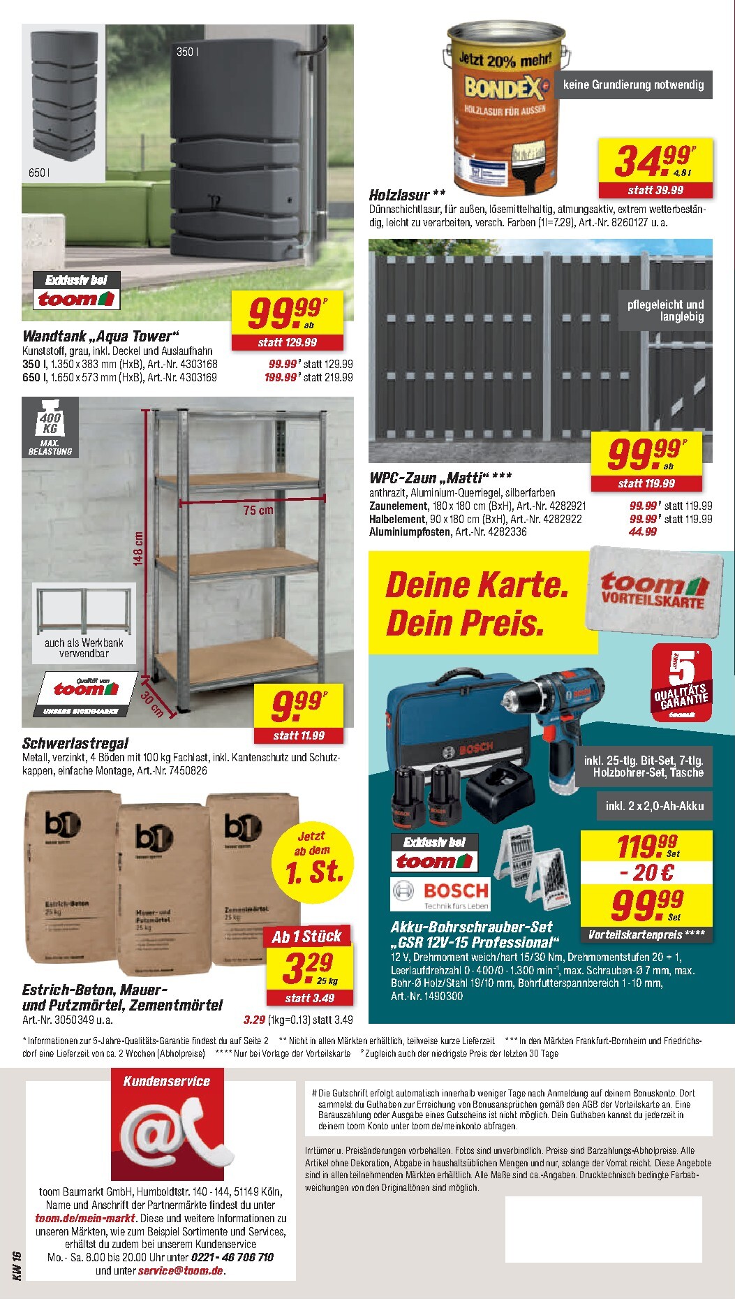 Auch Heimwerker kommen bei toom nicht zu kurz. Ein herausragendes Angebot ist das Bosch Akku-Schrauber-Set „AdvancedImpact 18“ inklusive zweier Akkus und umfangreichem Zubehör für nur 99,99 € – ein exklusiver Vorteilspreis für Inhaber der Vorteilskarte. Für Bauprojekte stehen Materialien wie Estrich-Beton oder Mauer- und Putzmörtel ab 3,29 € pro Sack bereit. Praktische Lösungen wie der Wandtank „Aqua Tower“ zur Regenwassernutzung oder das vielseitige Schwerlastregal für 9,99 € helfen dabei, Ordnung zu schaffen und nachhaltig zu wirtschaften. Alle Details zu diesen und vielen weiteren Schnäppchen finden Sie im aktuellen toom Prospekt.