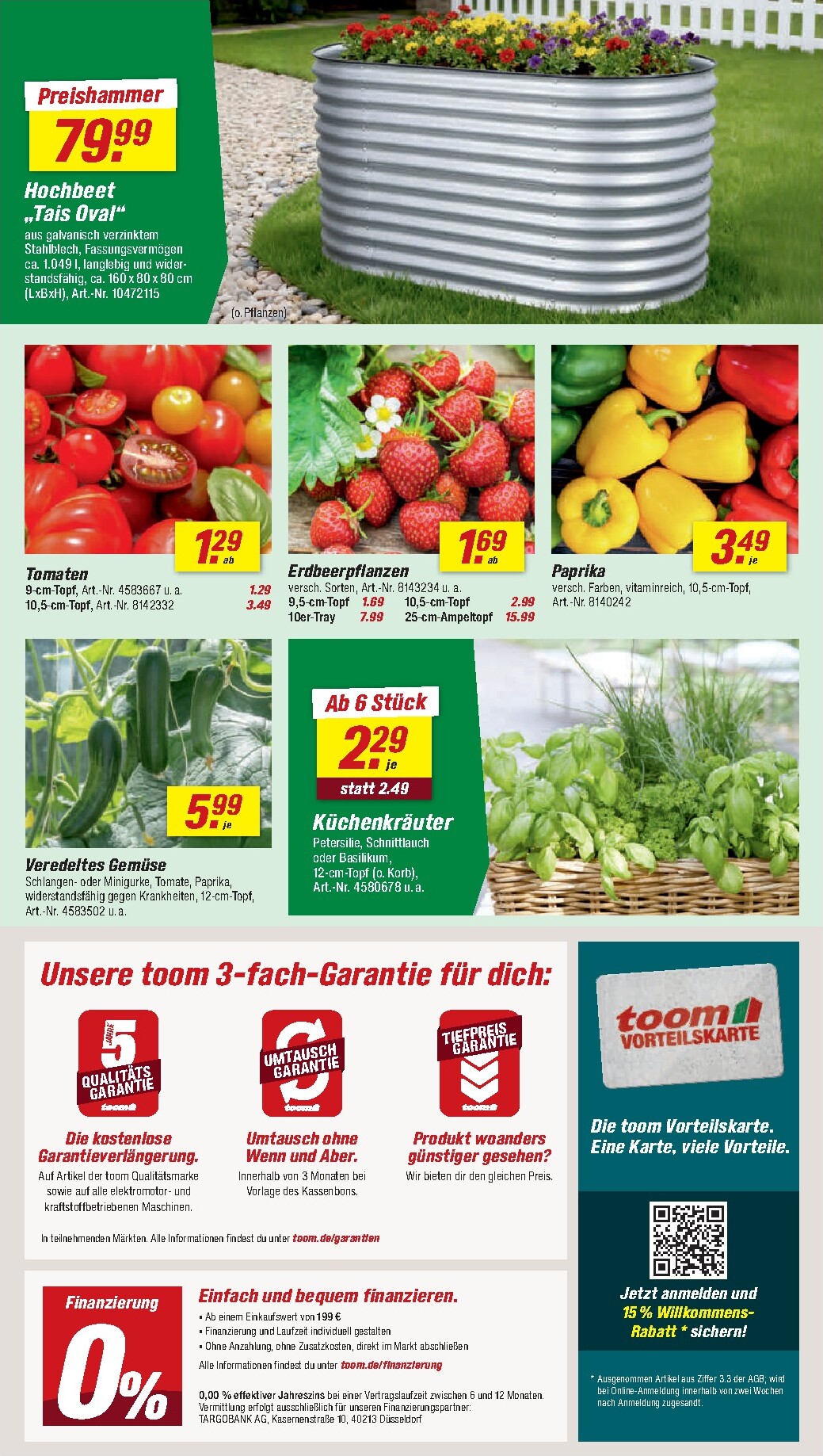 Für alle, die es lieben, ihr eigenes Obst und Gemüse anzubauen, hält der Prospekt eine riesige Auswahl bereit. Von Bio-Obststräuchern wie Heidelbeeren oder Himbeeren bis hin zu einer Vielfalt an Tomaten-, Paprika- und Gurkenpflanzen ist alles dabei. Besonders attraktiv sind die Küchenkräuter, die im 6er-Pack für nur 2,29 € angeboten werden. Damit verfeinern Sie jedes Gericht mit frischen Aromen aus eigenem Anbau. Die Angebote im toom Prospekt 11.04.2026 – 17.04.2026 Angebote Angebote zum Blättern umfassen auch das robuste Hochbeet „Tap Hol“ aus Metall für nur 79,99 €, das eine langlebige und stilvolle Ergänzung für jeden Garten darstellt.