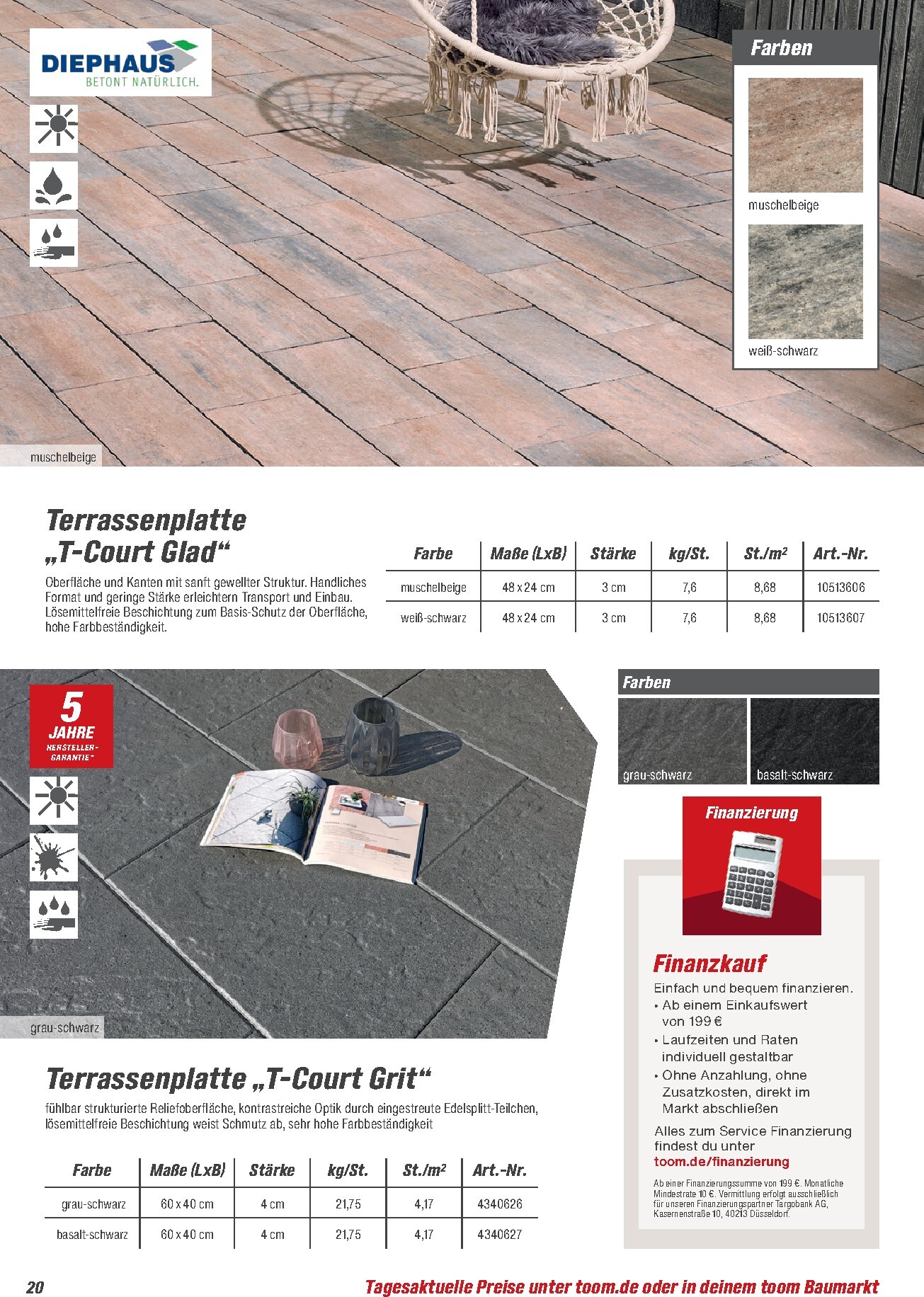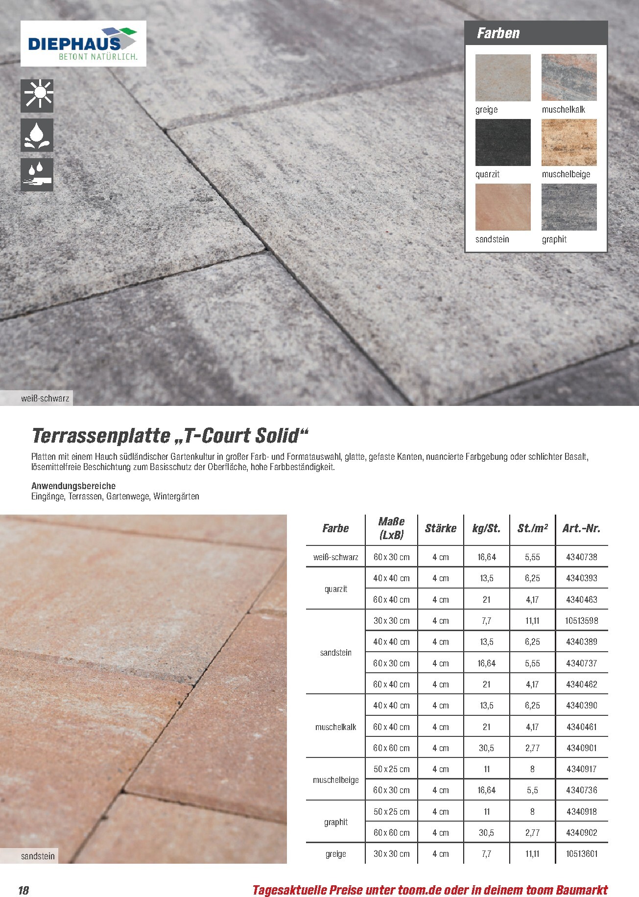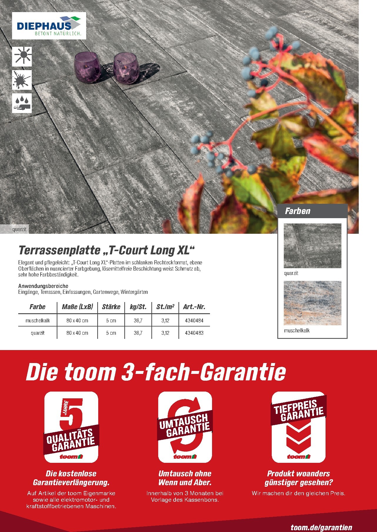 Der neue toom Katalog für Gartenbaustoffe ist da und inspiriert zu neuen Projekten unter freiem Himmel. Ob Sie eine moderne Terrasse, einen rustikalen Weg oder eine stilvolle Einfassung planen, hier finden Sie alles, was Sie für die Umsetzung benötigen. Mit dem toom Prospekt Heute 2026 Gartenbau-stoffe zum Blättern entdecken Sie eine riesige Auswahl an Materialien und Ideen, um Ihren Außenbereich in eine persönliche Wohlfühloase zu verwandeln. Toom wurde zudem zum 10. Mal in Folge als Preissieger für sein hervorragendes Preis-Leistungs-Verhältnis ausgezeichnet, was Ihnen die Sicherheit gibt, hochwertige Produkte zu fairen Konditionen zu erhalten. Von Terrassenplatten über Pflastersteine bis hin zu Mauersystemen – die Qualität und Vielfalt werden Sie überzeugen.
