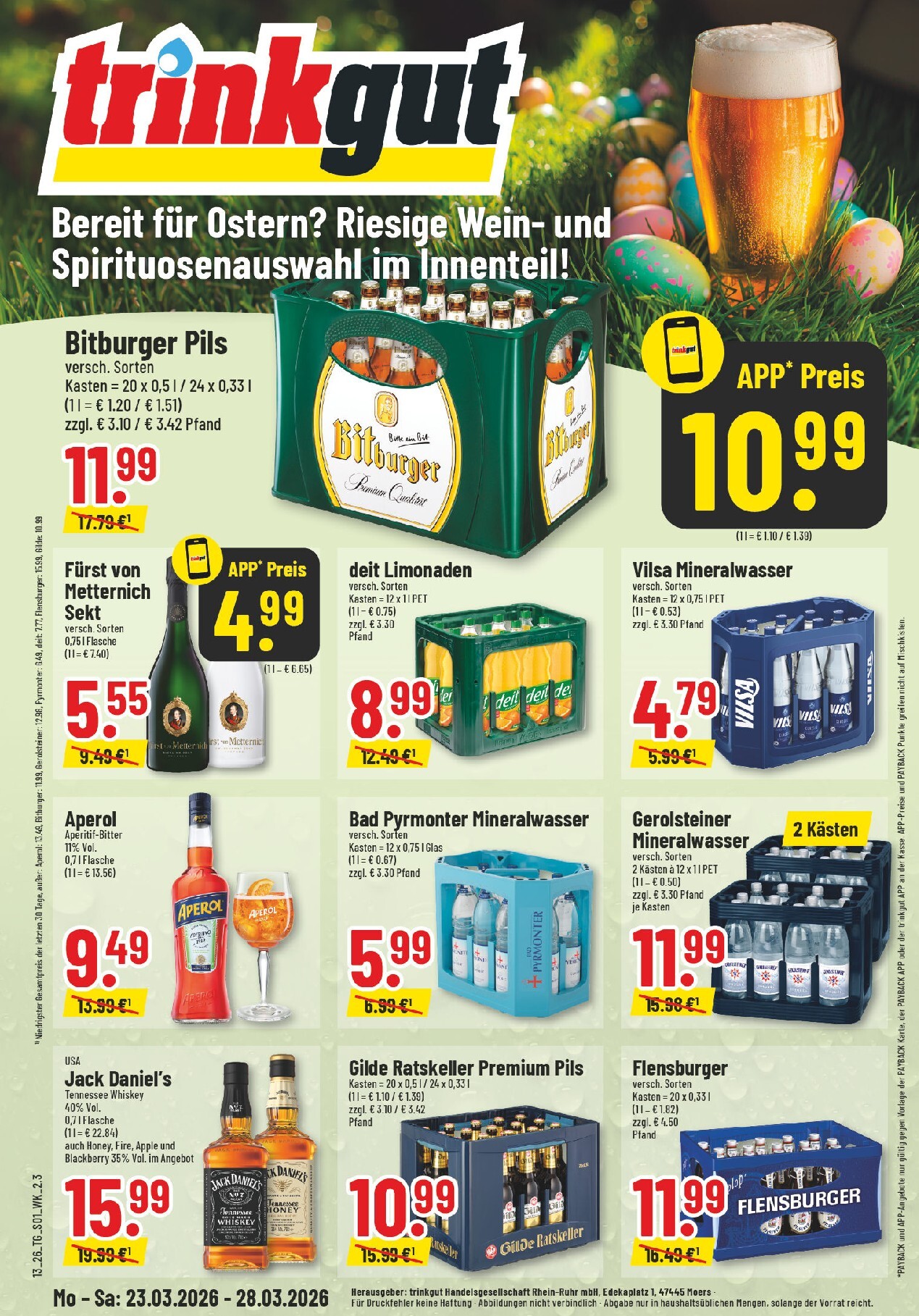 Ostern steht vor der Tür und Trinkgut hat vom 23. bis zum 28. März 2026 die passenden Angebote, um die Feiertage gebührend zu feiern. In dieser Woche finden Sie eine riesige Auswahl an Getränken zu unschlagbaren Preisen, die jede Osterfeier bereichern. Werfen Sie einen Blick auf die aktuellen Trinkgut Prospekt 23.03.2026 – 28.03.2026 zum Blättern Online Online und entdecken Sie Top-Deals für Bier, Wein und Spirituosen. Ein Highlight ist das Bitburger Pils, das im Kasten für nur 11,99 € statt 17,79 € erhältlich ist. Mit der Trinkgut-App sparen Sie sogar noch mehr und zahlen nur 10,99 €.