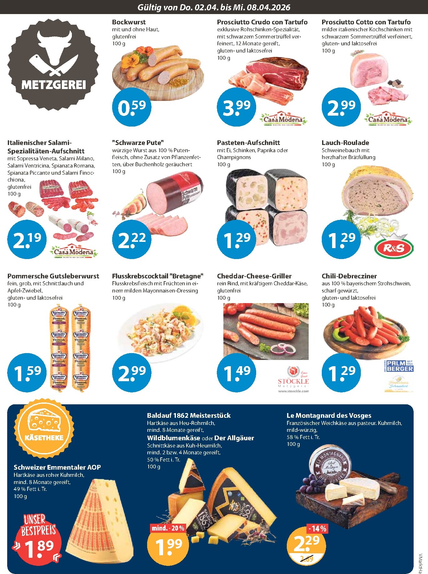 Die Frischetheken bei V-Markt überzeugen mit Qualität und Preis. Entdecken Sie italienische Salami-Spezialitäten im Aufschnitt für 2,19 € oder den exklusiven Prosciutto Crudo mit Tartufo für 3,99 € pro 100g. Auch die Fleischauswahl ist beeindruckend, von Rinder-Hüftsteak für 2,22 € bis zu frischem Krustenbraten für nur 0,79 € pro 100g. Mit dem V-Markt Prospekt 02.04.2026 – 08.04.2026 digitaler Prospekt wird der Wocheneinkauf zum Vergnügen, denn hier finden Sie alles für herzhafte Gerichte und die schnelle Küche.