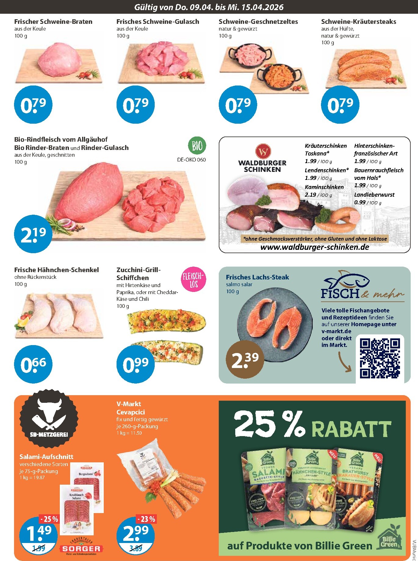Die Metzgerei- und Käsetheke im V-Markt präsentiert ebenfalls erstklassige Produkte zu attraktiven Preisen. Im aktuellen V-Markt Prospekt 09.04.2026 – 15.04.2026 Angebote Angebote zum Blättern finden Sie unter anderem herzhaften Salami-Aufschnitt 1A für 1,99 € pro 100 g oder die würzige Käsebierwurst für 1,79 € pro 100 g. Eine besondere Spezialität ist der Neuburger für 2,19 € pro 100 g. Käseliebhaber kommen mit dem Almwiesenkäse für 2,89 € oder der Jungen Hexe bzw. Roten Hexe für nur 1,99 € voll auf ihre Kosten. Zudem gibt es einen sensationellen Rabatt von 25 % auf alle Produkte von Billie Green, ideal für alle, die pflanzliche Alternativen lieben.