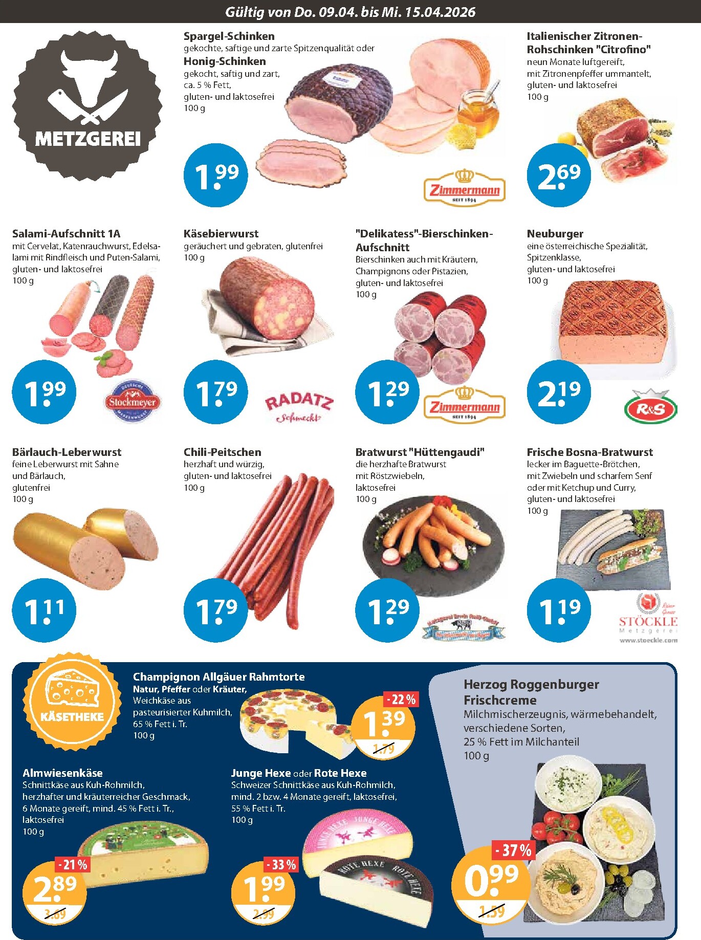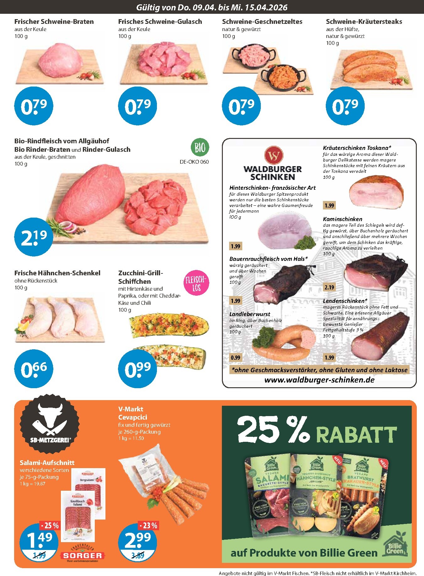 Die Metzgerei-Theke überzeugt mit Qualität und Vielfalt. Genießen Sie feinen Spargel-Schinken oder würzigen Salami-Aufschnitt für je 1,99 € pro 100g. Ein besonderes Angebot ist das Bio-Rindfleisch vom Allgäuhof für nur 2,19 € pro 100g. Der aktuelle V-Markt Prospekt 09.04.2026 – 15.04.2026 Werbung bietet die perfekte Gelegenheit, erstklassige Fleisch- und Wurstwaren zu entdecken und dabei clever zu sparen. Zudem gibt es einen attraktiven Rabatt von 25 % auf alle veganen Produkte der Marke Billie Green, was eine tolle Alternative darstellt.