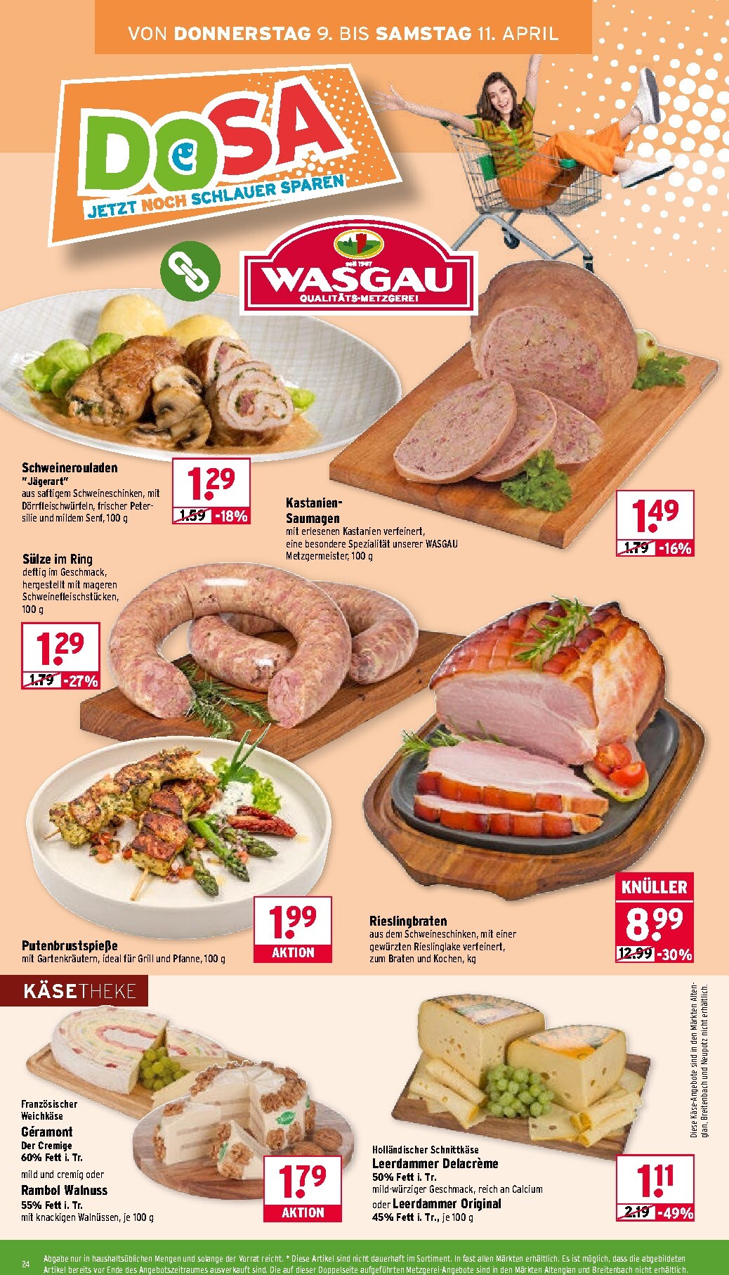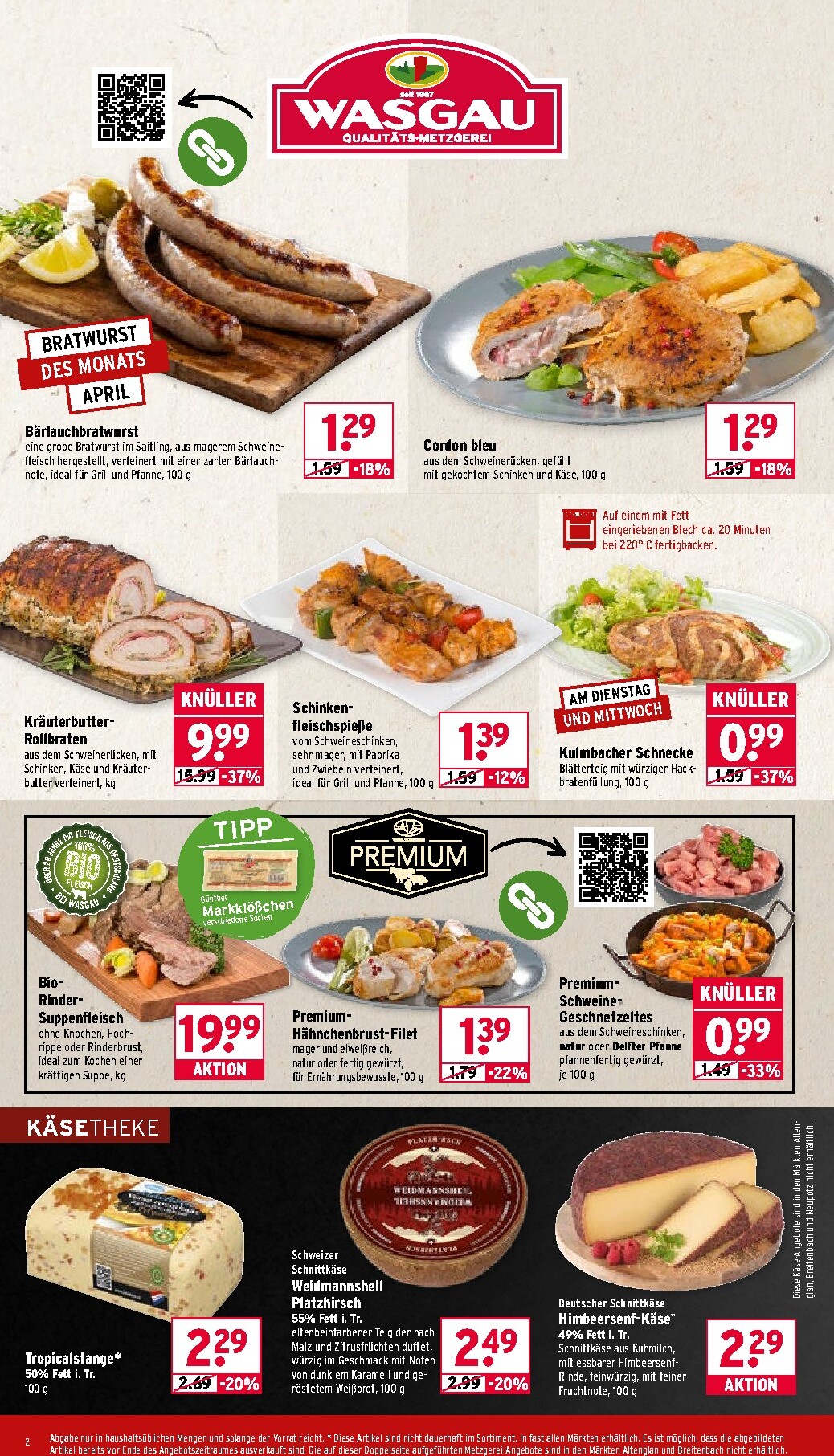Die hauseigene Wasgau Metzgerei steht für Qualität und Frische, was sich auch in den aktuellen Angeboten widerspiegelt. Entdecken Sie den saftigen Kräuterbutter-Rollbraten für 9,99 € pro Kilogramm oder das klassische Cordon bleu, gefüllt mit Schinken und Käse, für nur 1,29 € je 100 g. Diese Woche können Sie mit dem Wasgau Prospekt 07.04.2026 – 11.04.2026 Angebote Angebote zum Blättern auch an der Käsetheke kräftig sparen. Wie wäre es mit dem cremig-würzigen Tropicalstange oder dem exklusiven Deutschen Schafskäse Himbeersenf-Käse für jeweils nur 2,29 €? Diese Spezialitäten sind eine Bereicherung für jede Käseplatte.
