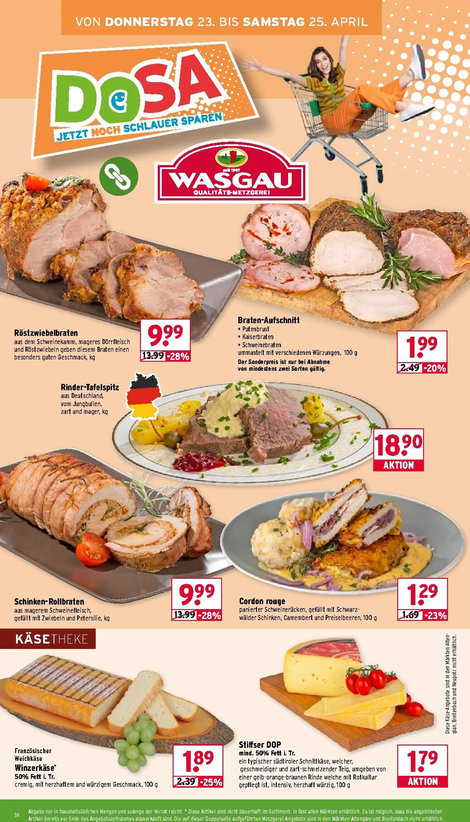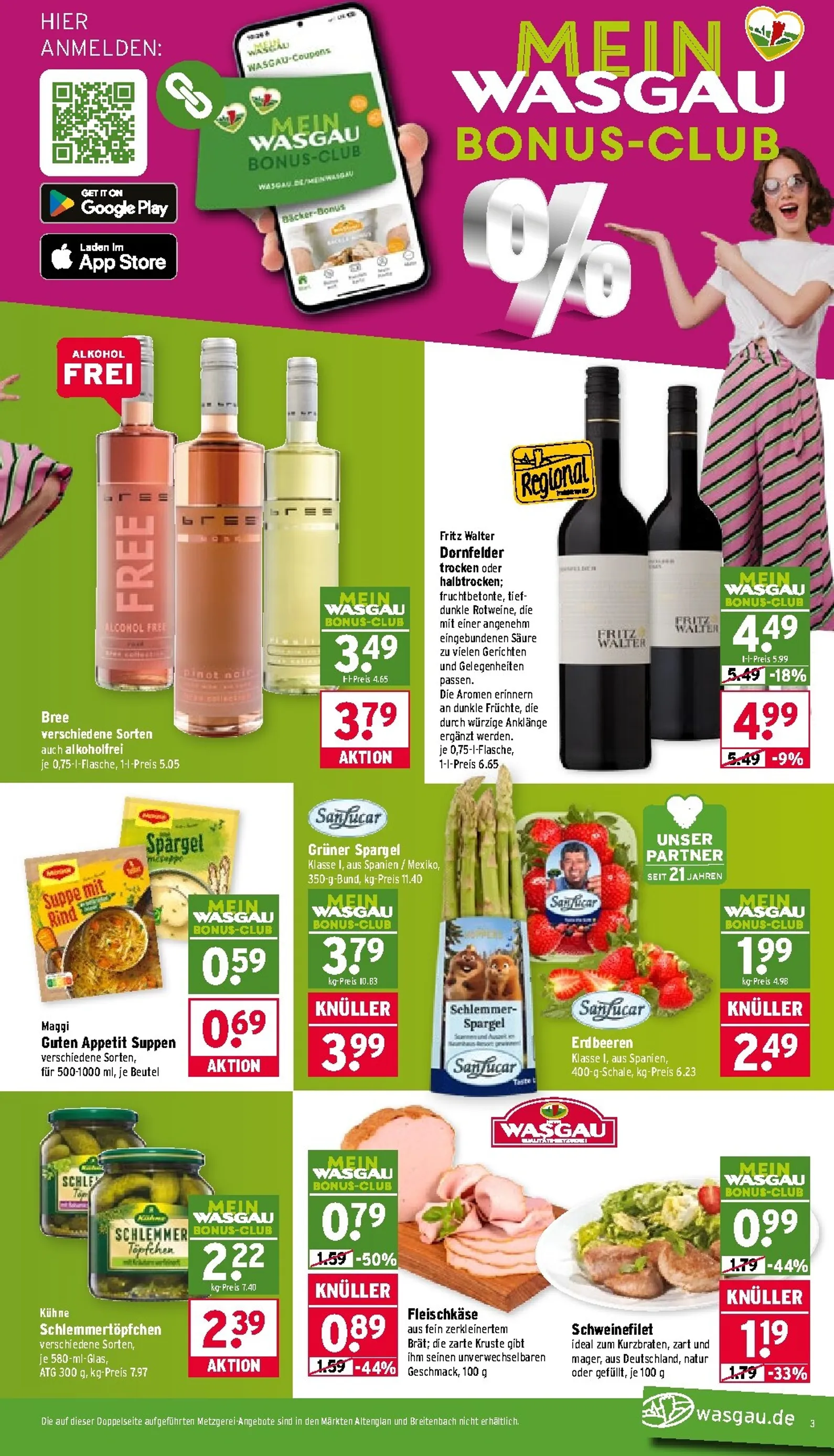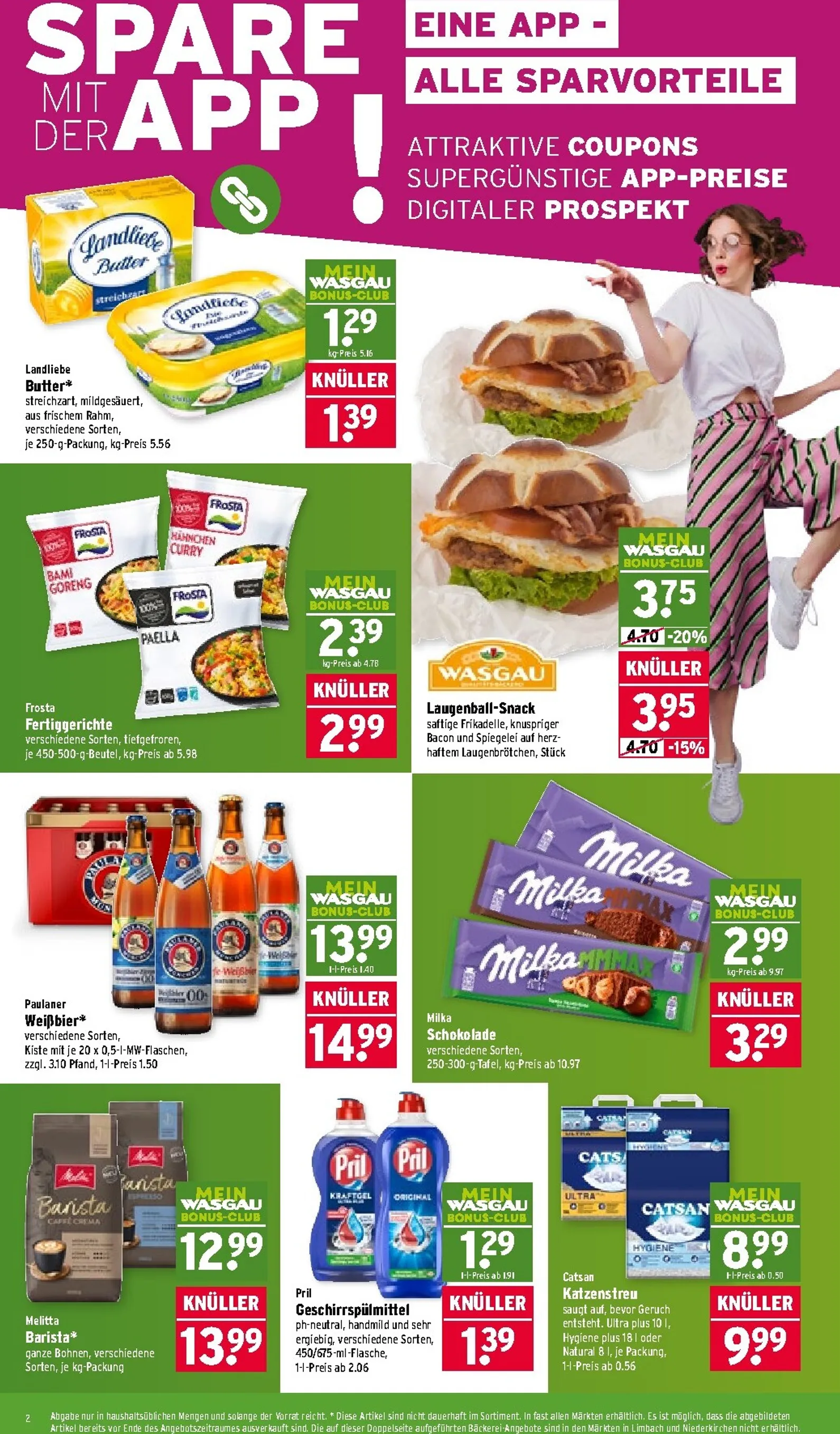 Als Mitglied im „Mein Wasgau Bonus-Club“ profitieren Sie von noch besseren Preisen. Mit der App sparen Sie diese Woche zusätzlich bei beliebten Artikeln wie Landliebe Butter oder Frosta Fertiggerichten. Auch Milka Schokolade ist zum exklusiven App-Preis erhältlich. Zum Wochenende steigert Wasgau die Vorfreude mit weiteren tollen Aktionen, wie frischem Rinderhackfleisch und saftigen Erdbeeren, die perfekt für ein leckeres Familienessen oder einen fruchtigen Nachtisch sind.
