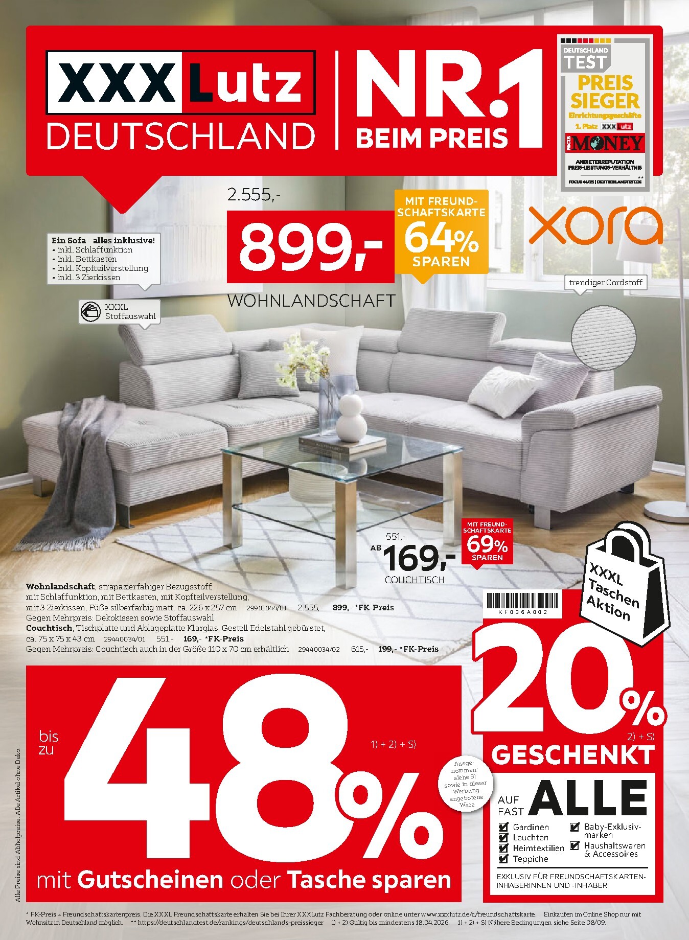Der neue XXXLutz Prospekt ist da und bringt unglaubliche Sparmöglichkeiten direkt zu Ihnen nach Hause. Unter dem Motto ‚Nr. 1 beim Preis‘ präsentiert XXXLutz eine Fülle von Angeboten, die das Einrichten und Dekorieren zum Vergnügen machen. Ein Highlight ist die riesige ‚48% geschenkt‘ Aktion, bei der Sie mit Gutscheinen auf fast alle Abteilungen sparen können. Wer auf der Suche nach einem neuen Mittelpunkt für das Wohnzimmer ist, wird bei der Xora Wohnlandschaft für nur 899 € statt 2.555 € fündig – eine Ersparnis von 64%. Mit dem XXXLutz Prospekt 09.04.2026 – 18.04.2026 Aktuelle Angebote sichern Sie sich diese und viele weitere Top-Deals für ein stilvolles Zuhause.